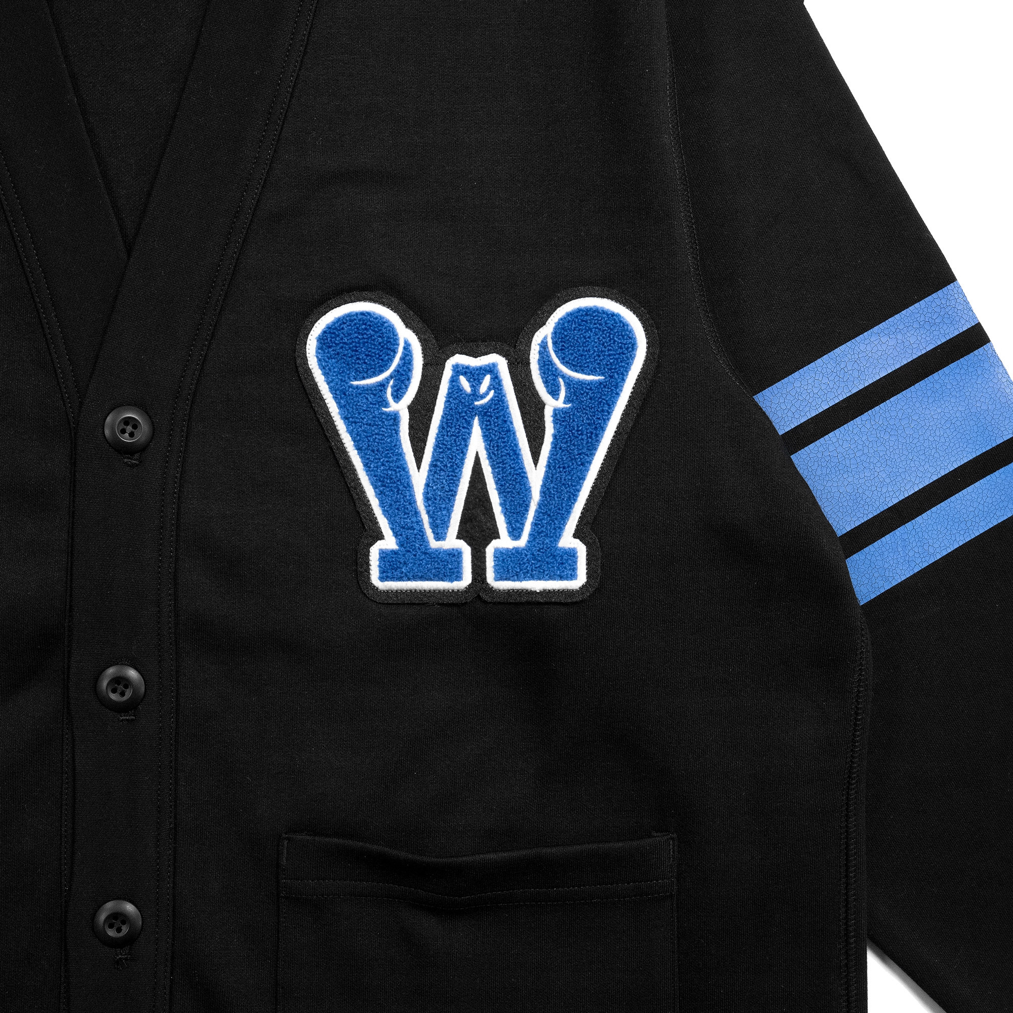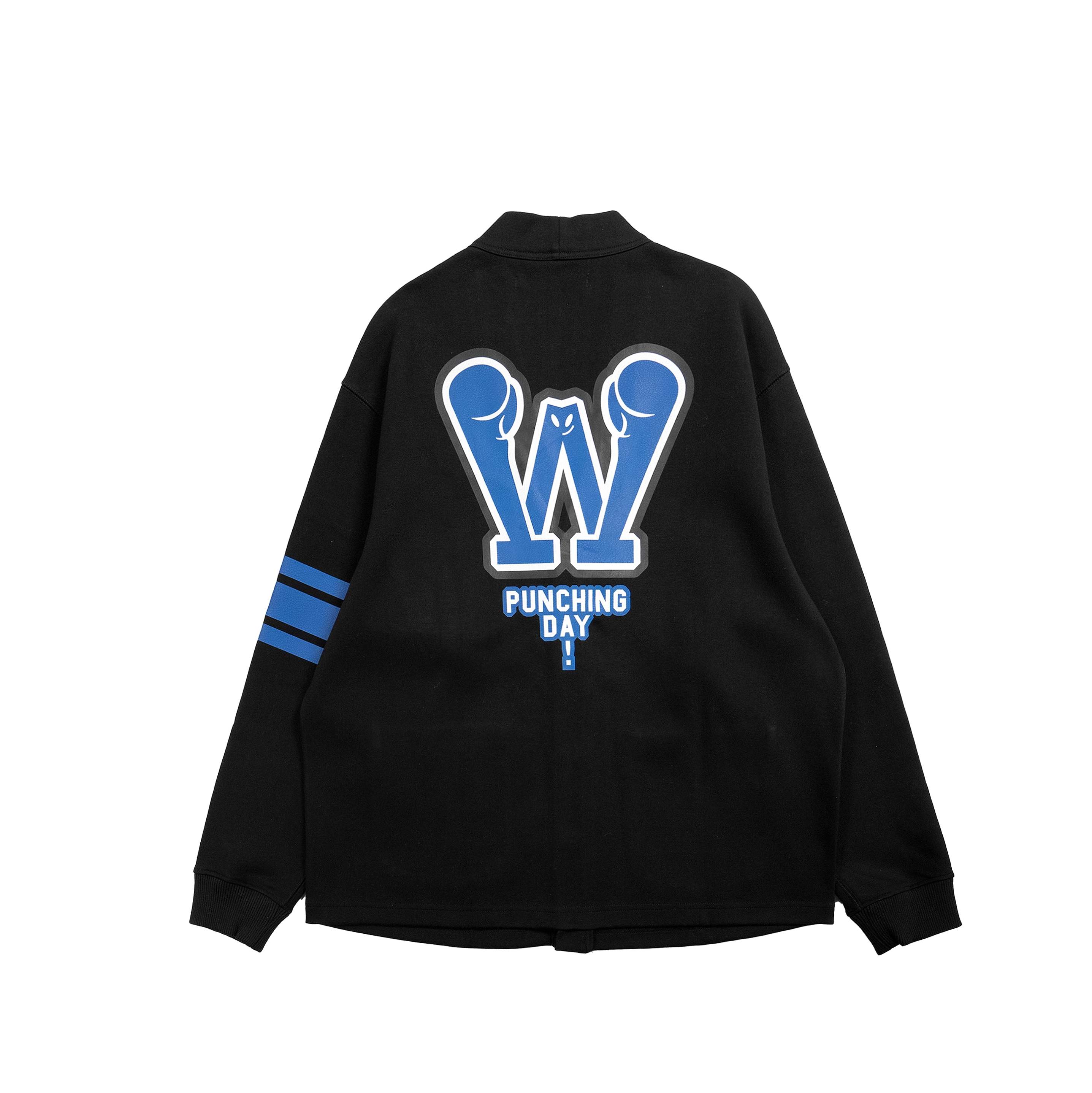 A classic old-school varsity jacket infused with boxing-inspired details. Features a bold shattered Winning Face print on the back and matching stripe accents on the sleeves. Crafted from heavy-duty cotton with embroidered Winning Face cuffs—bringing a touch of luck to every fight.