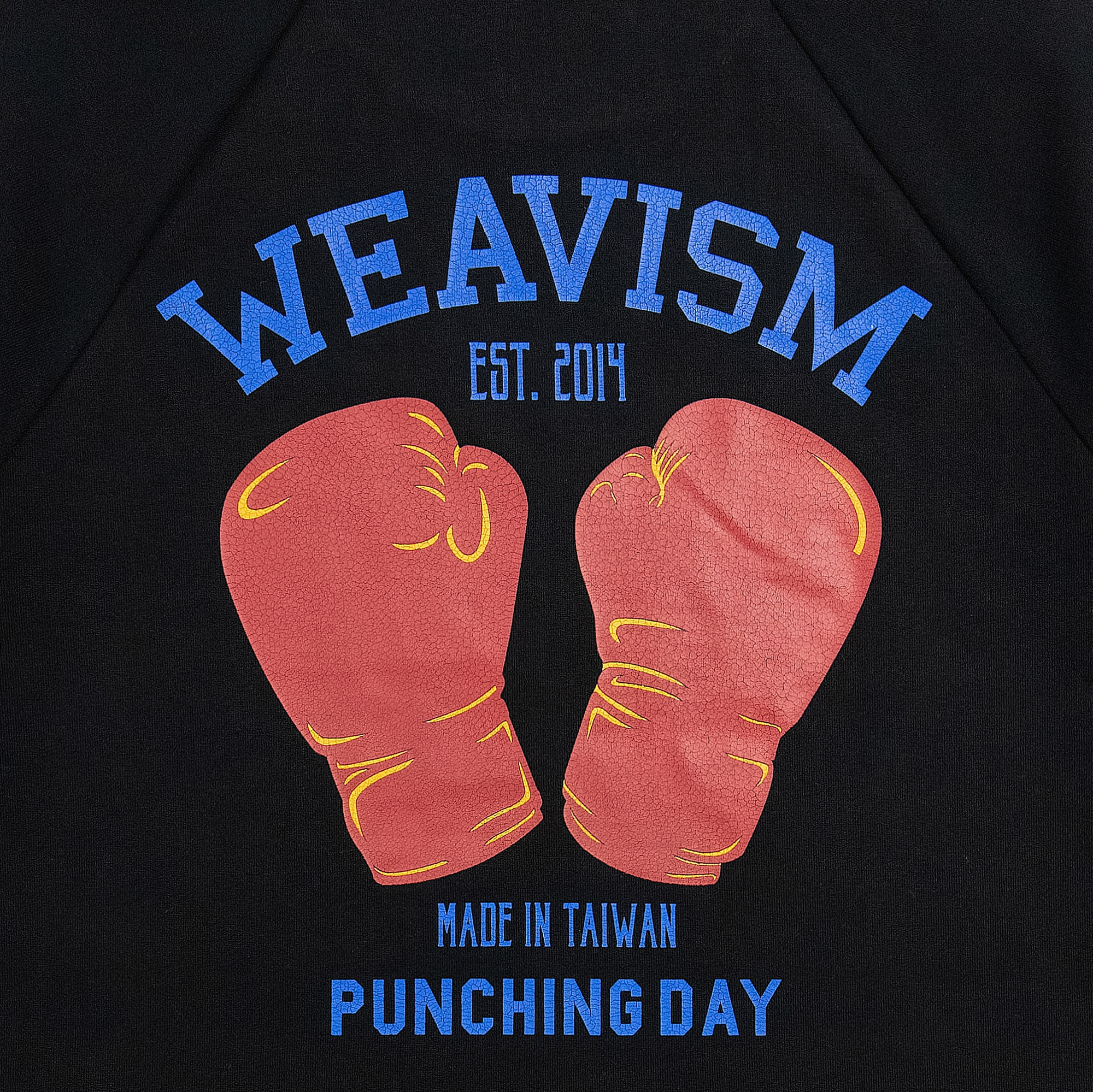 A heavyweight 14 oz organic cotton tee inspired by true boxing professionals. Designed with a raglan cut for ease of movement and an oversized fit. Features a bold shattered boxing gloves print on the back.