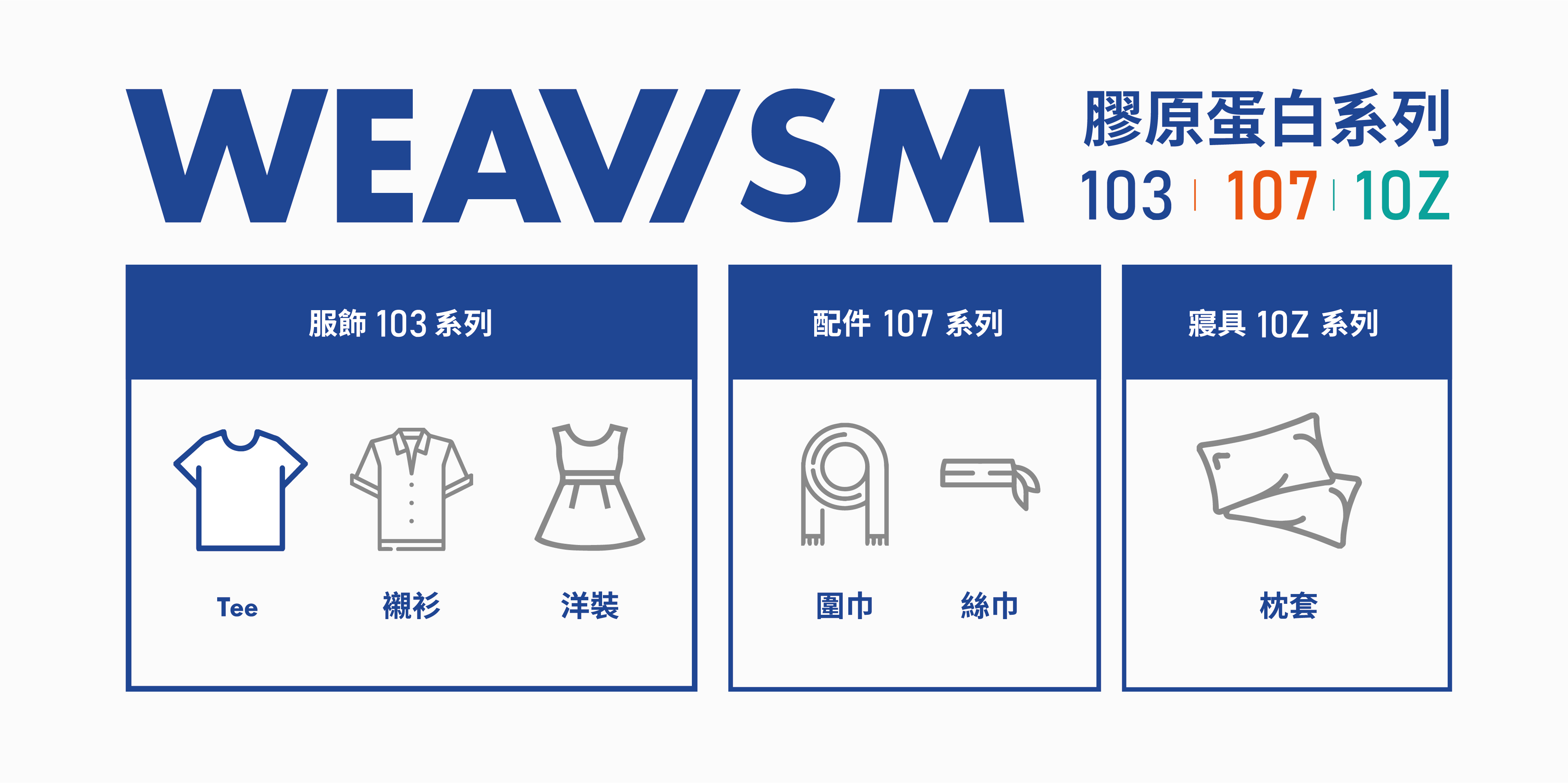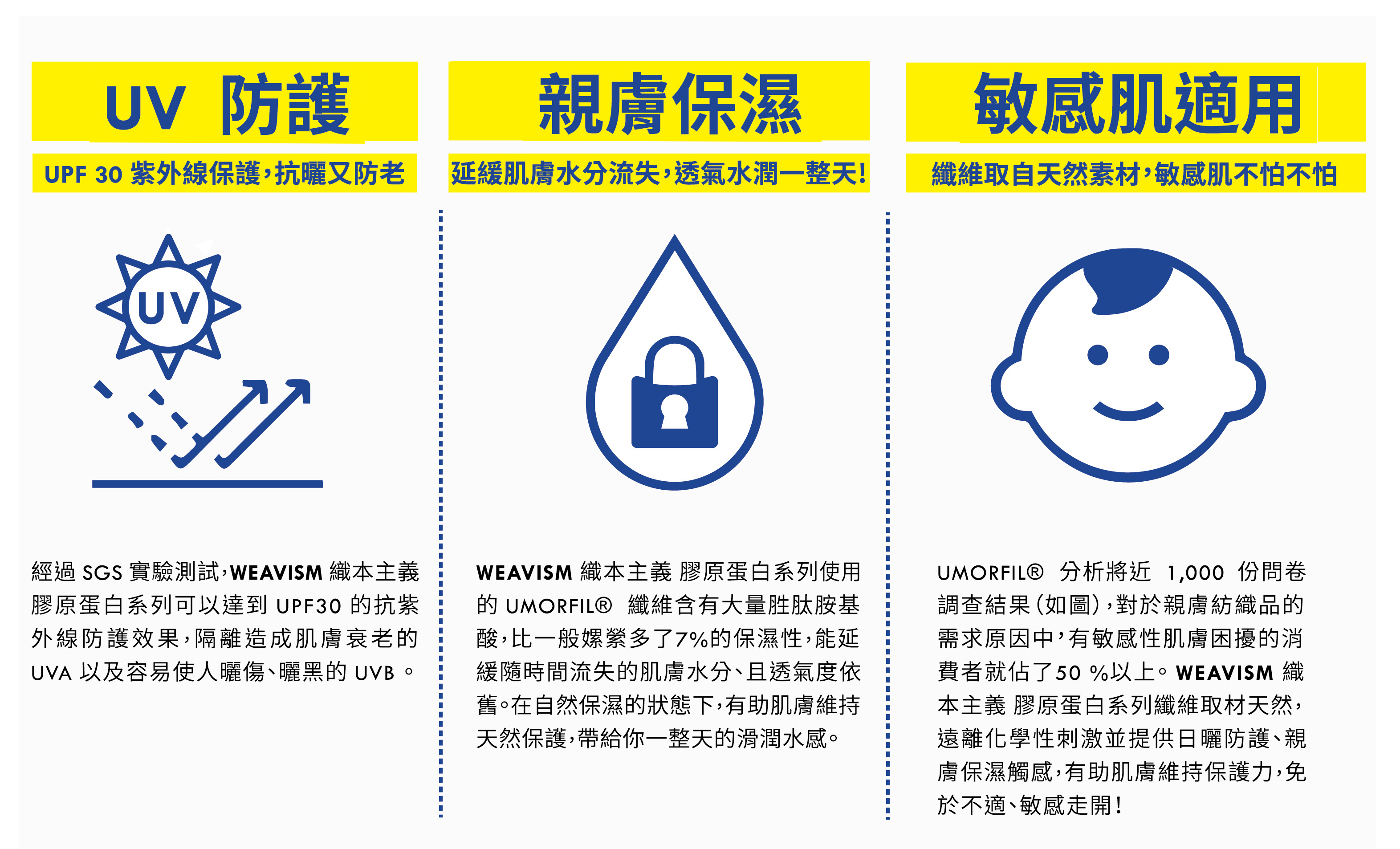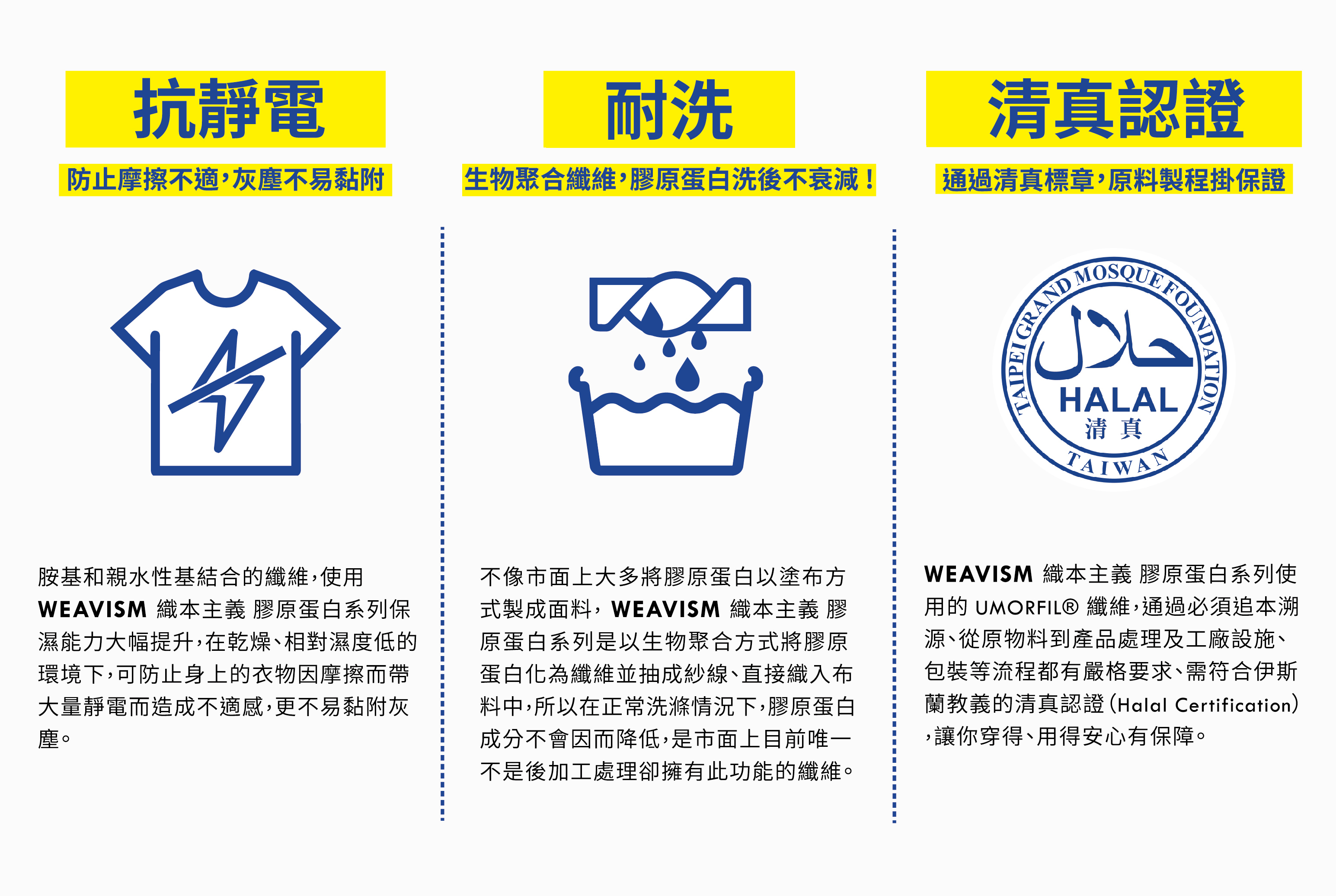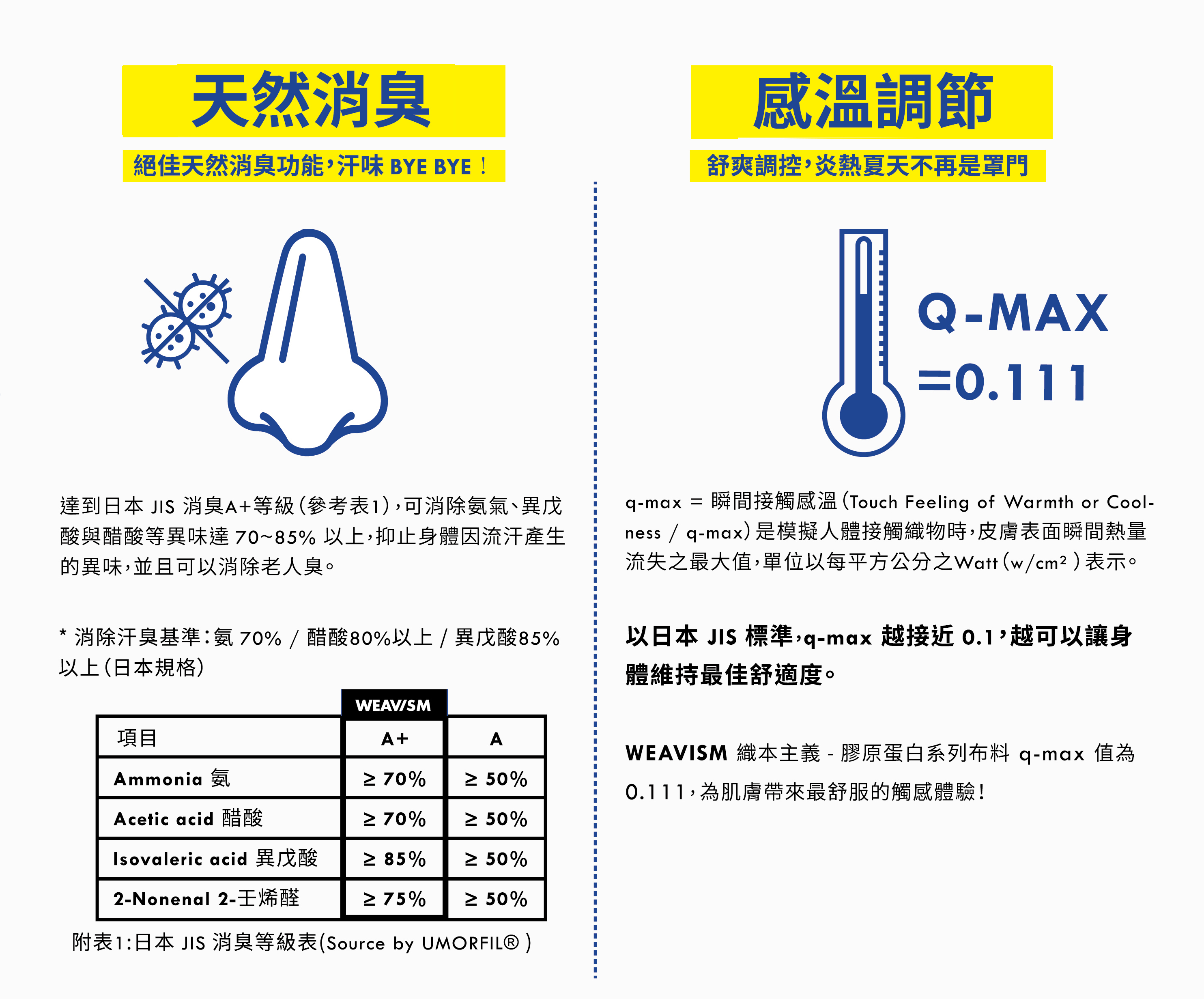 WEAVISM 膠原蛋白系列能有效分解汗味等體臭,並藉由空氣中的水份及風將惱人的異味帶走。達到日本JIS消臭A+等級,可以消除氨氣、異戊酸與醋酸等異味達70~80%以上, 而且功能更不會因洗滌而衰減,就算是長時間穿著也能持續清爽、自在。