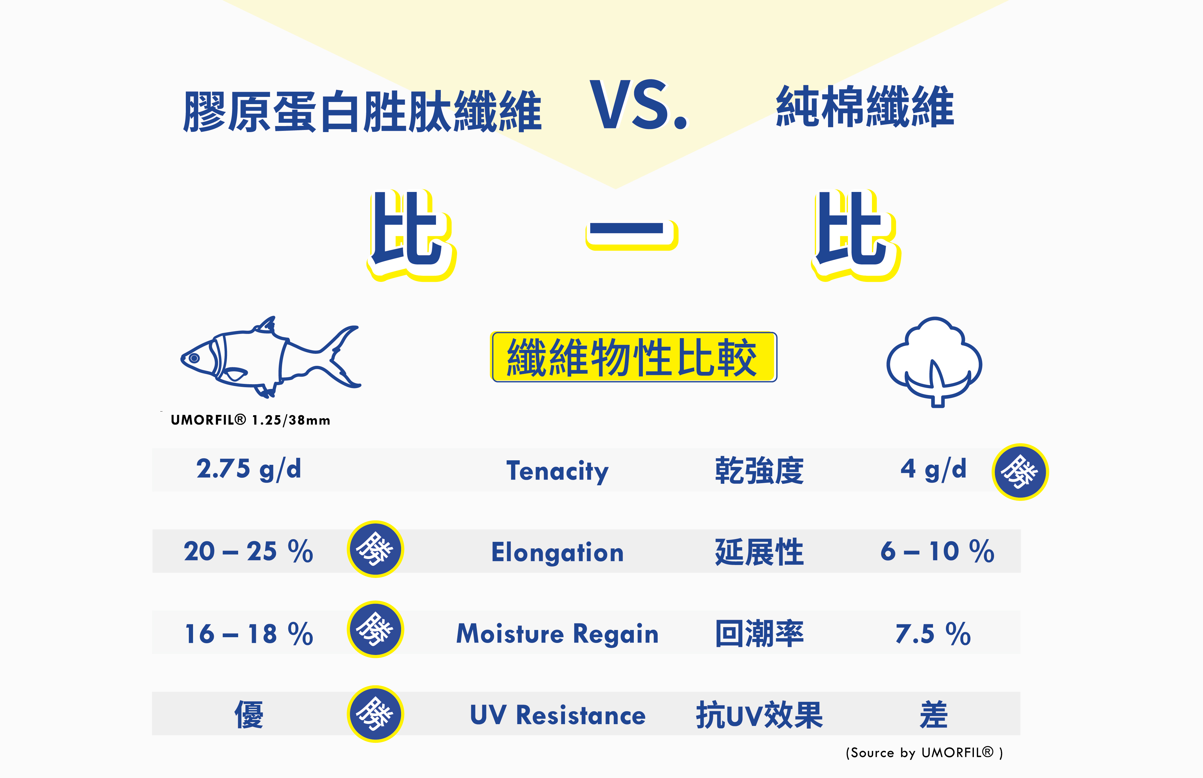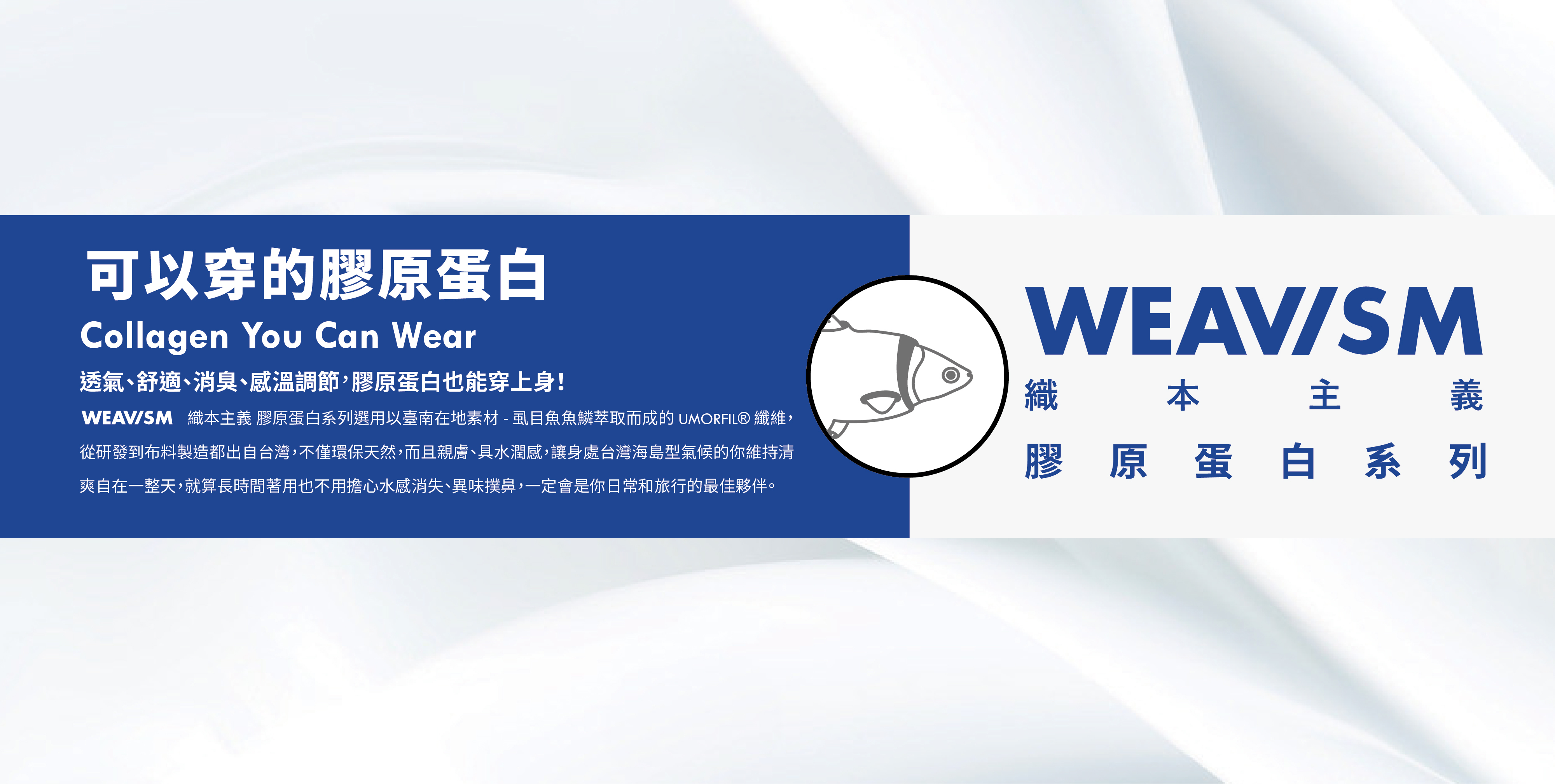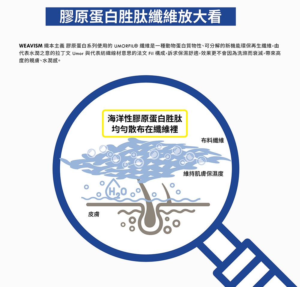 所選用的 UMORFIL® 膠原蛋白胜肽纖維,運用臺南在地素材-虱目魚魚鱗,提煉出膠原蛋白並再以超分子技術使之與紡織纖維結合。布料不但親膚、保濕具水潤感、抗靜電,而且擁有極強的天然消臭能力。