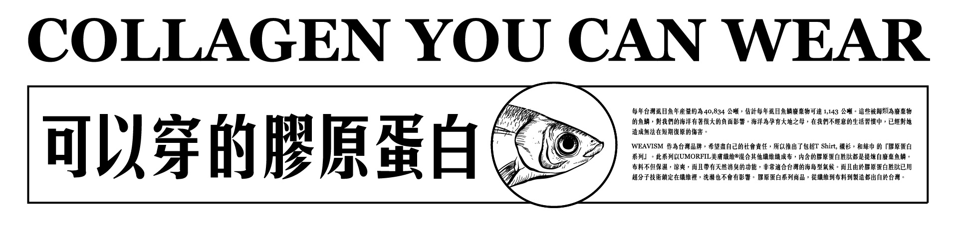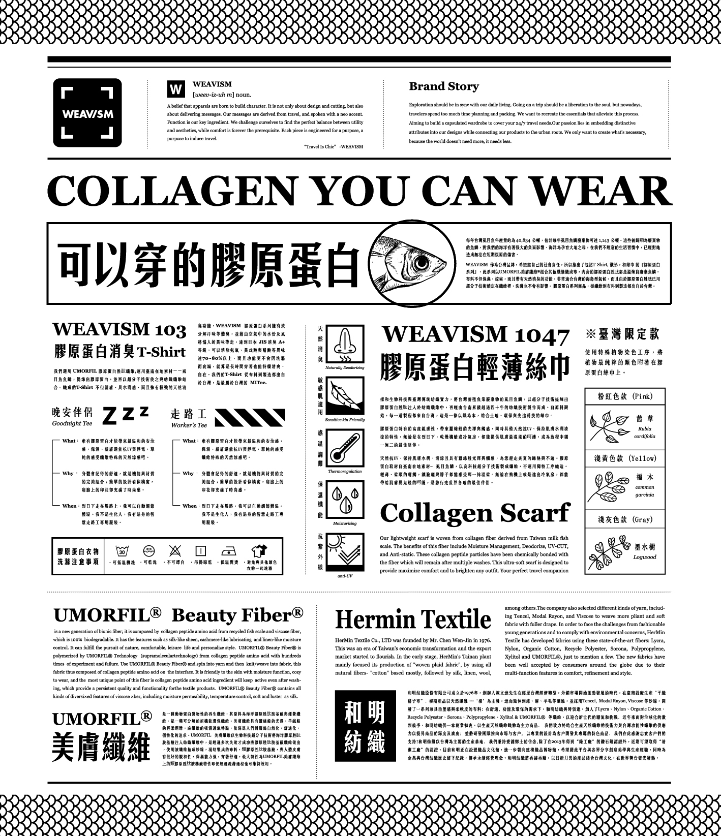 WEAVISM 織本主義 以建構一個為旅人而生的衣櫃為初衷,透過不同”有理由”的設計以及持續創新的布料融入到每件單品中。最廣為人知的是品牌所選用的 UMORFIL® 膠原蛋白胜肽纖維,運用臺南在地素材-虱目魚魚鱗,提煉出膠原蛋白並再以超分子技術使之與紡織纖維結合。布料不但親膚、具水潤感,而且擁有極強的天然消臭功能。WEAVISM 膠原蛋白系列能有效分解汗味等體臭,並藉由空氣中的水份及風將惱人的異味帶走。達到日本JIS消臭A+等級,可以消除氨氣、異戊酸與醋酸等異味達70~80%以上, 而且功能更不會因洗滌而衰減,就算是長時間穿著也能持續清爽、自在。