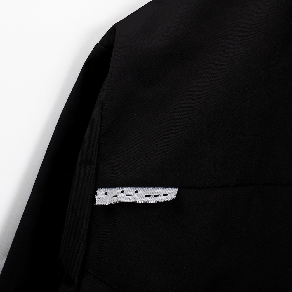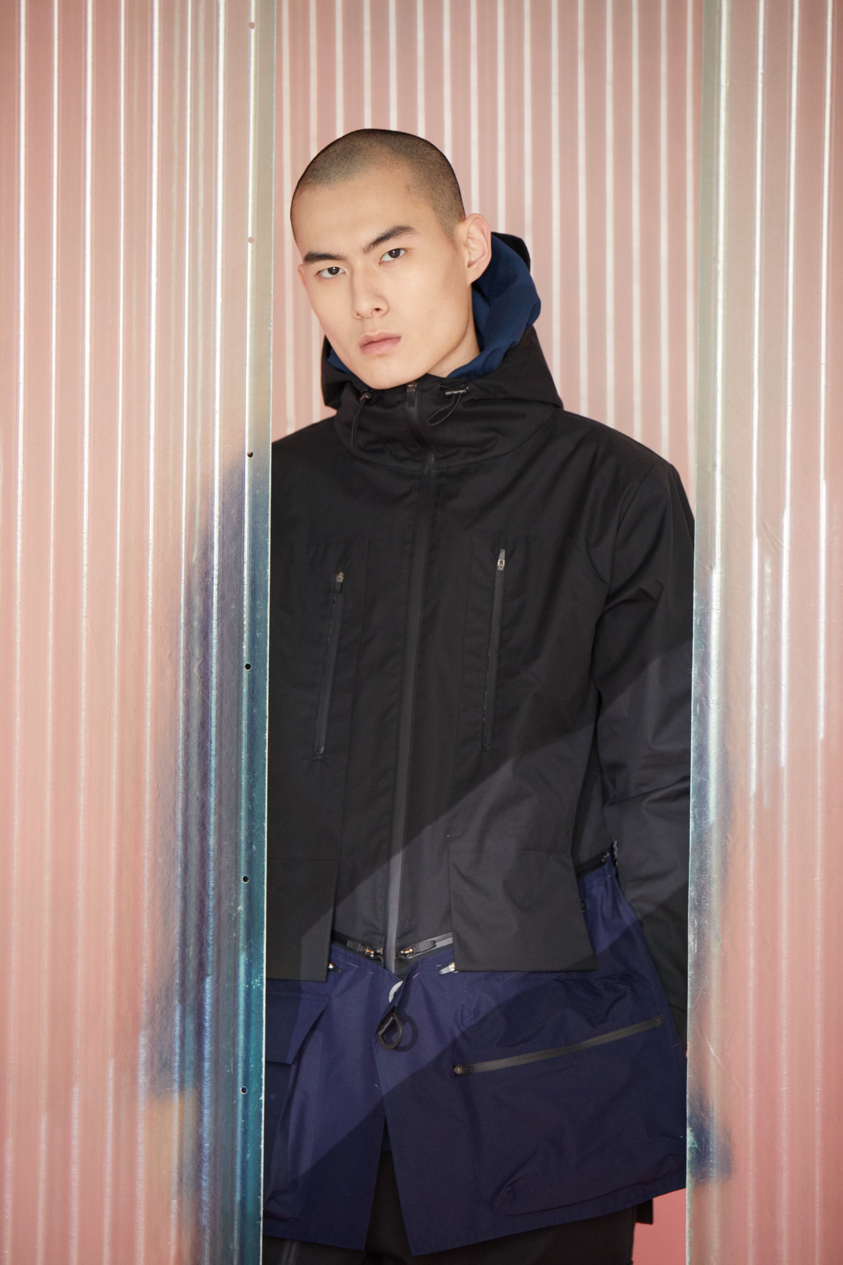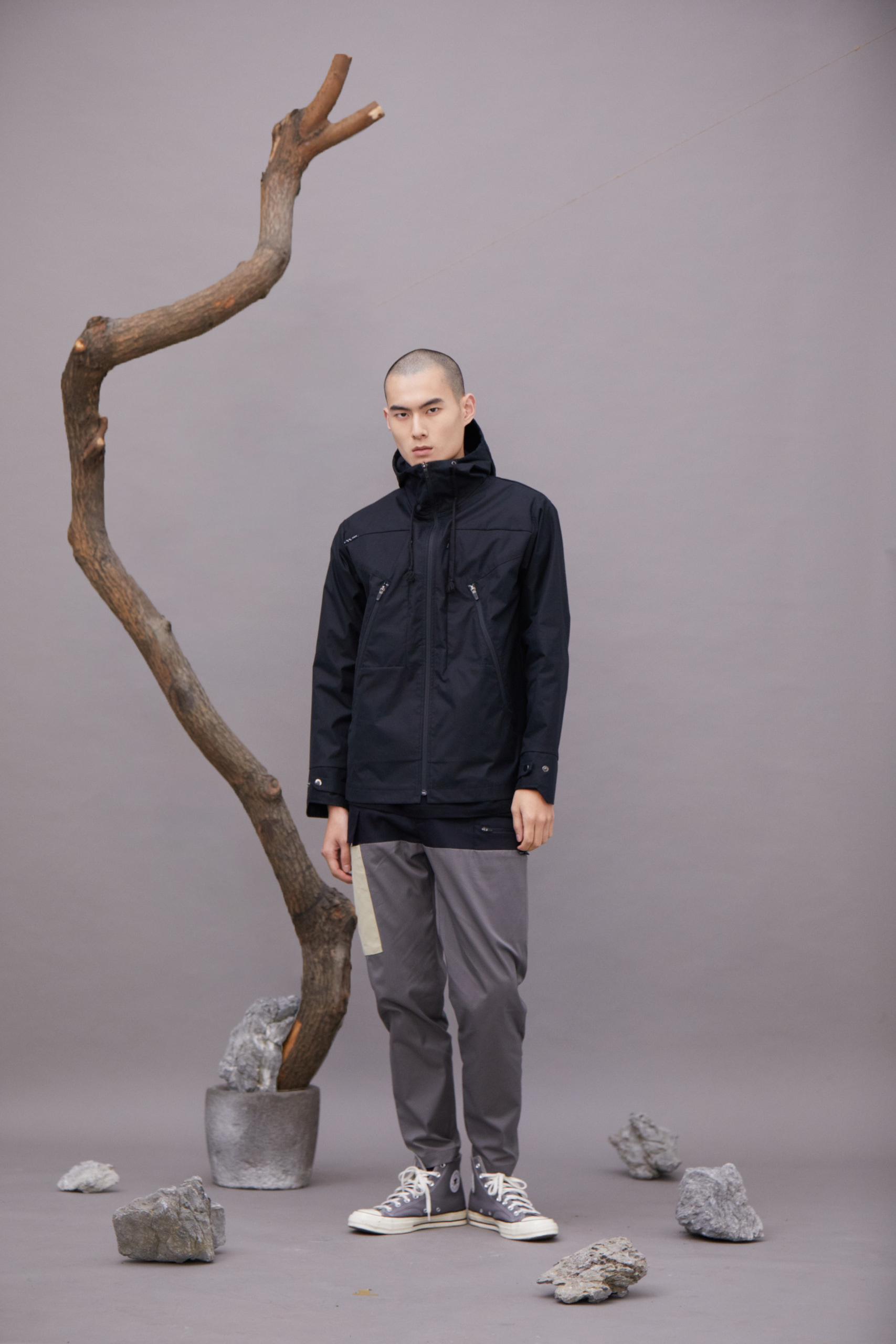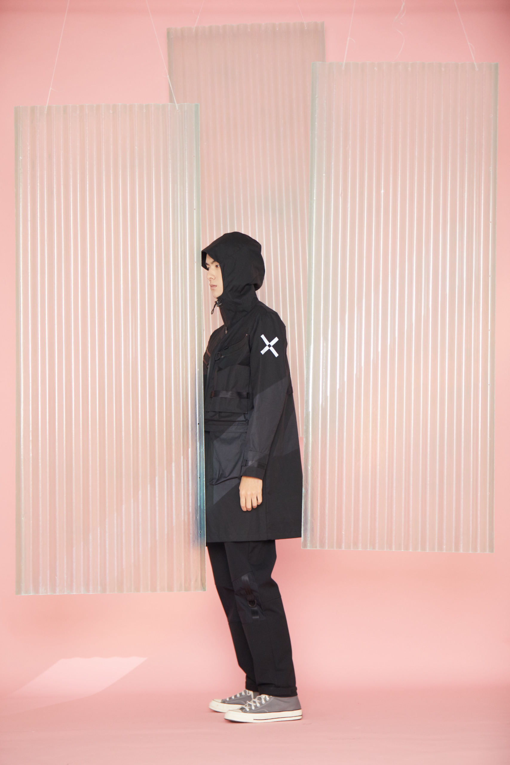 身前兩條斜線拉鍊拉開後是特殊三角形口袋;胸前有隱藏拉鍊也是口袋設計,可放手機或錢包等貴重物品也方便拿取。領口前的抽繩可依據每個人習慣自由調整帽子包覆程度。從肩線延伸到上背的切版縫線為整件帶來俐落感,摩斯密碼的信息代表「Eco」-永續時尚信念。