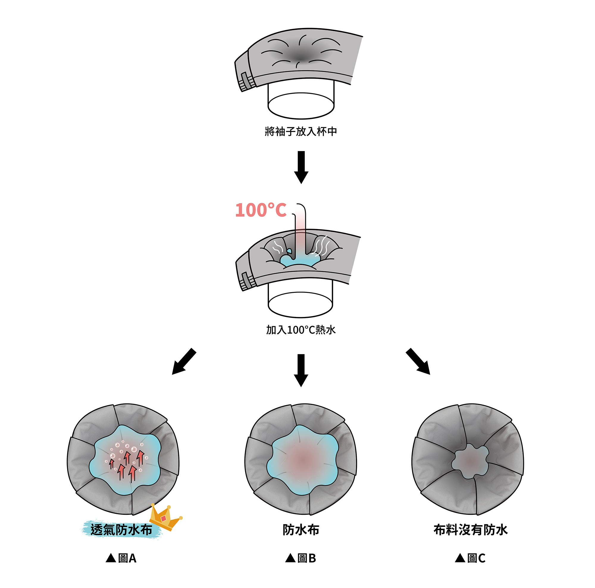 如果是一般沒有防水功能的外套,熱水倒下去後會直接滲入布料裡至衣服內側(圖C)。如果是市面上一般防水但沒有透濕功能的外套,熱水倒下去之後不會有氣泡產生,代表穿著時身體濕氣無法排出(圖B)。
