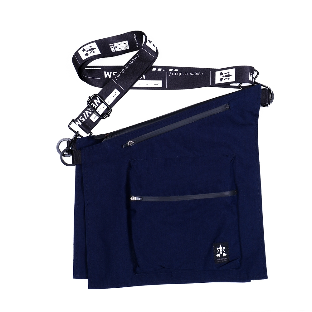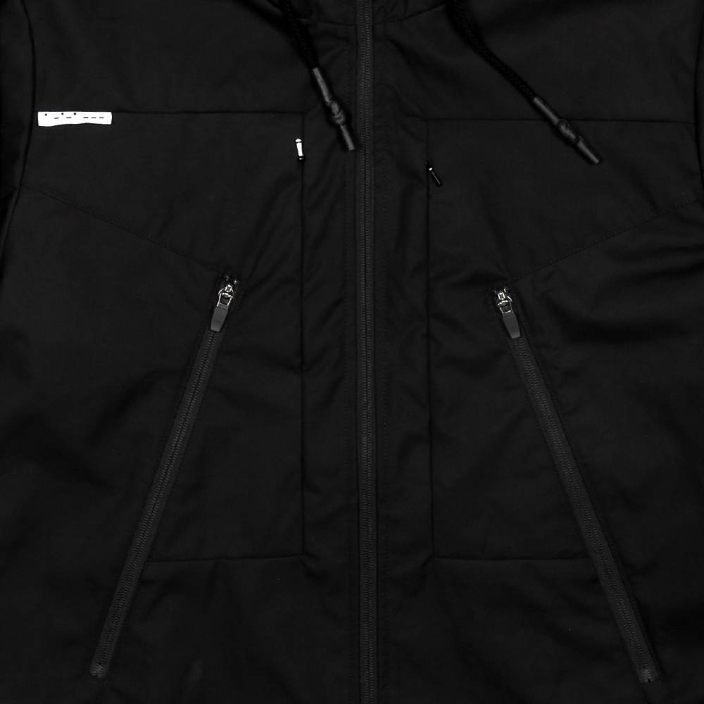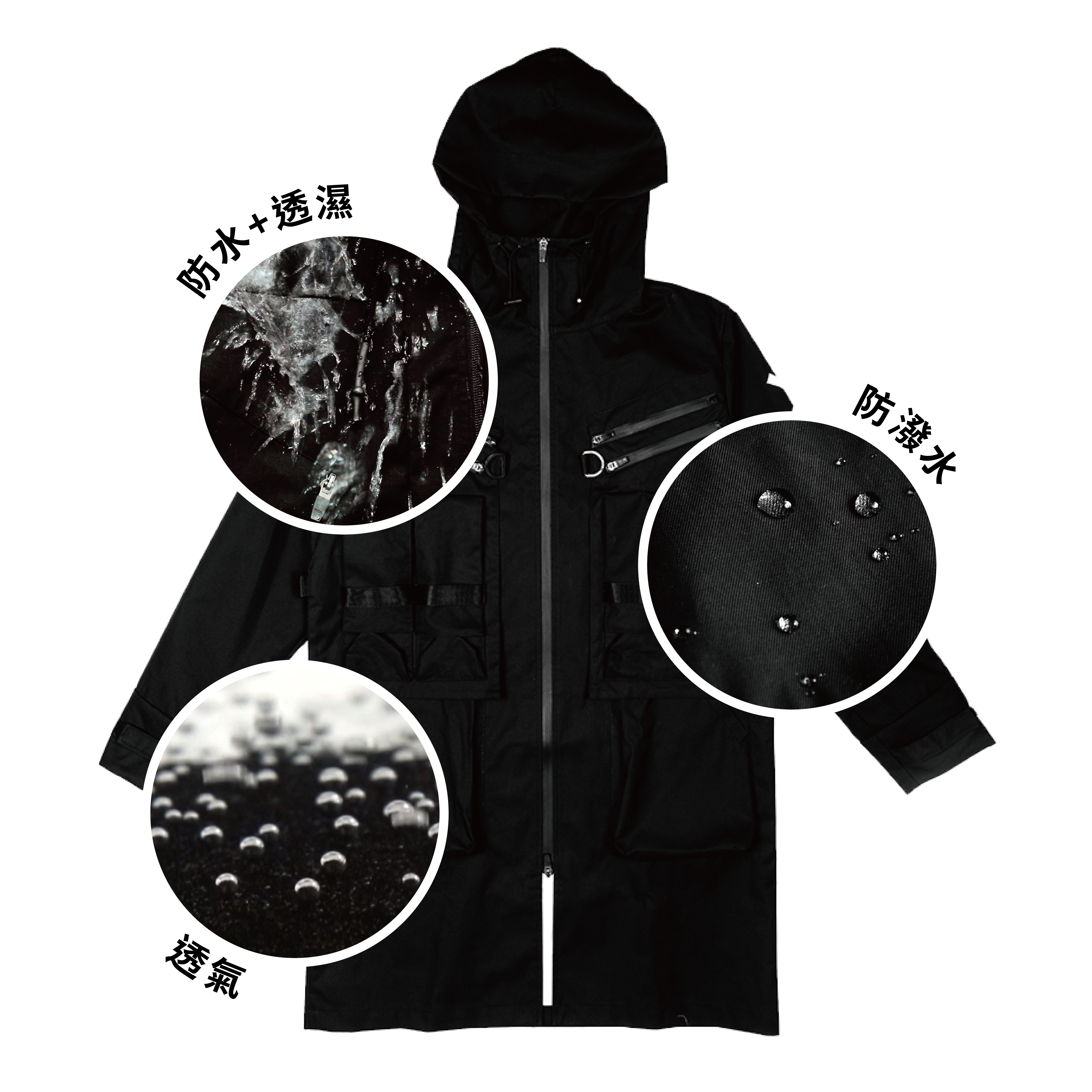 正面即三條YKK防水直條拉鍊,含有抽繩式帽子元素外,袖口日式魔鬼氈採用釦合設計,不會越用越鬆弛、更不會起毛球以防止風雨灌入。前下擺兩片多層口袋不僅作為口袋用,還可以拆下來變成隨身小包,並附贈一條背帶。而前後擺等高的風衣在口袋拆卸後呈現前短後長的視覺,兩種風格可以說一件抵兩件。