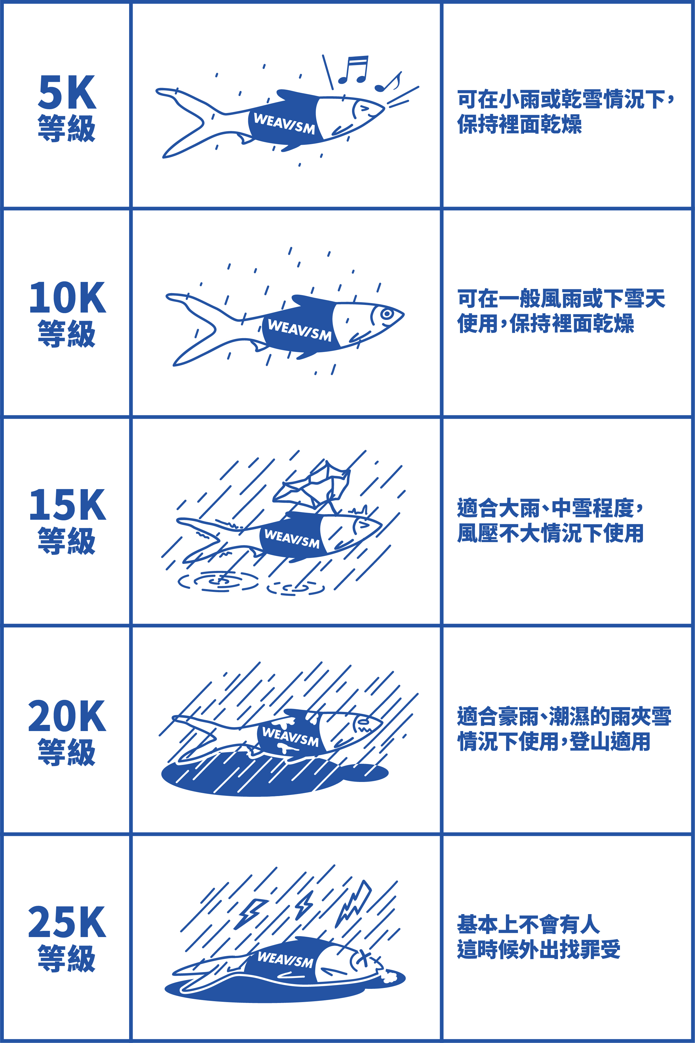首先,我們先瞭解防水代表什麼。衡量防水機能用的是防水係數(mmH2O),指的是每平方釐米(mm)面積上,可承受多少釐米的水柱衝擊而不滲水。數值越大代表防水性越強,而在機能服裝上防水係數通常是用K作為單位表達。那挑選防水外套的時候,要多少K才夠呢? 我們把常見的情況整理成以下表格,可以根據平常的活動習慣做為參考需求: