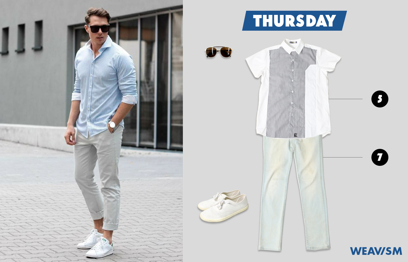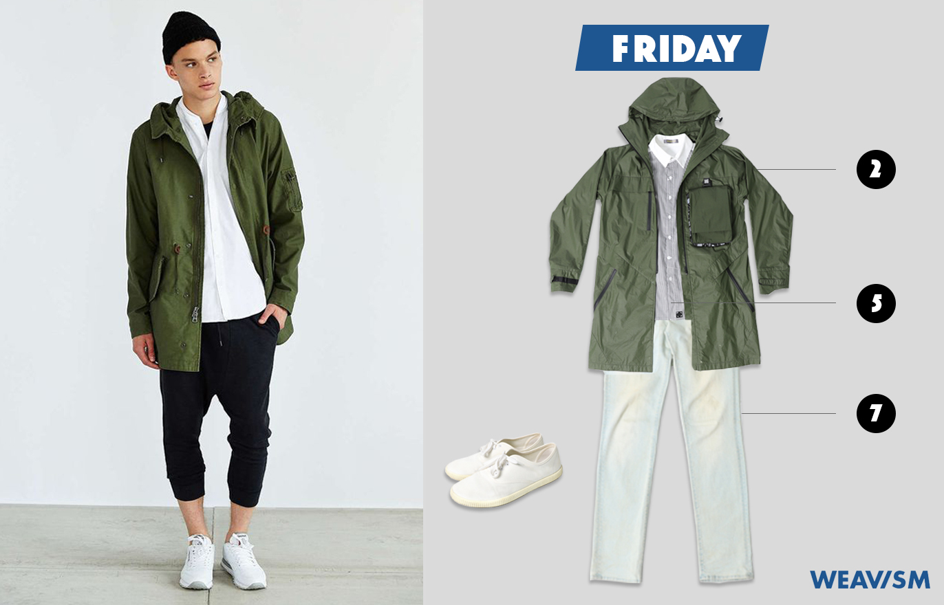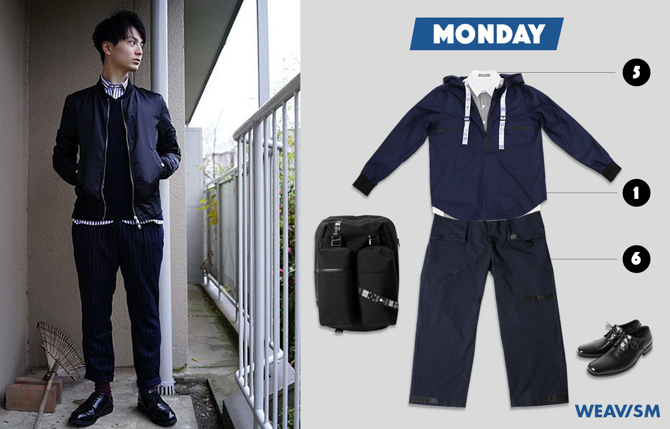 一星期的開始往往有重要的工作會議,但穿西裝實在覺得好束縛,試試多層次的深色 outdoor 單品搭配,也能穿出正式感。條紋拼接短袖襯衫外搭輕薄的藏青色連帽機能外套,足夠幫你面對冷氣房裡一個接一個的會議行程;黑色後背包維持穩重印象,卻有公事包少有的輕便和大容量,可以容納筆電、方便攜帶會議資料。
