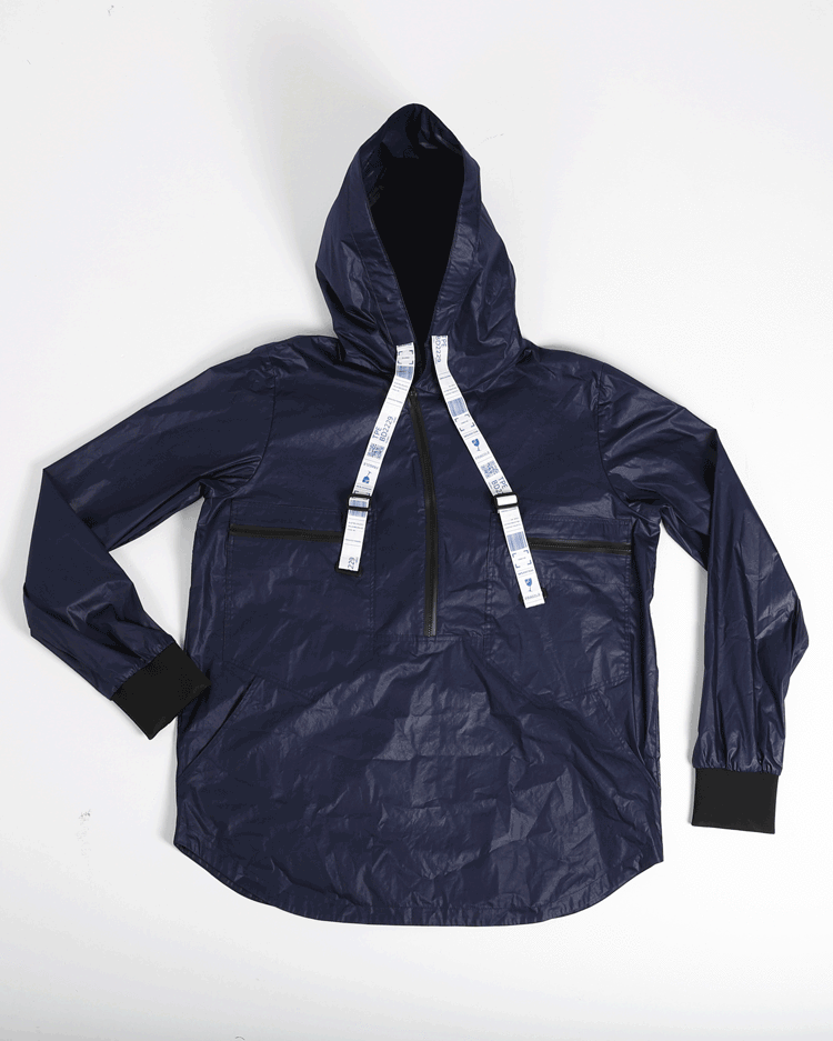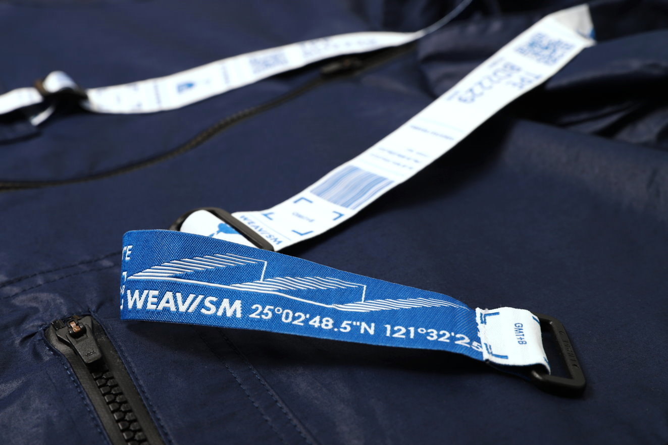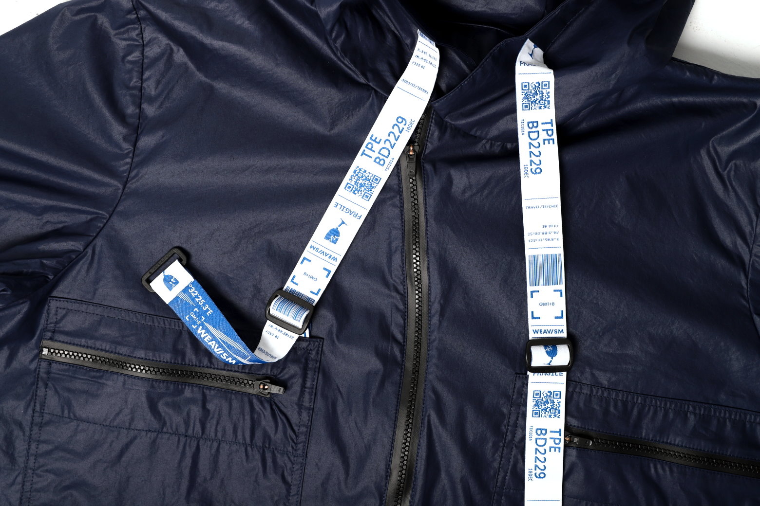 【你不知道的小細節】藏青色的輕旅行 - 連帽半襟雙貼袋外套,領口的藍、白雙面旅行織帶採用精緻的雙面織法,織帶上的「TPE BD2229」和座標數字分別代表 WEAVISM 八德旗艦店的地址(台北市八德路二段229號)和座標定位,掃描 QR Code 也可以連結到 WEAVISM 官網喔!