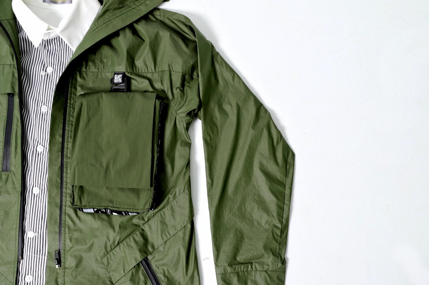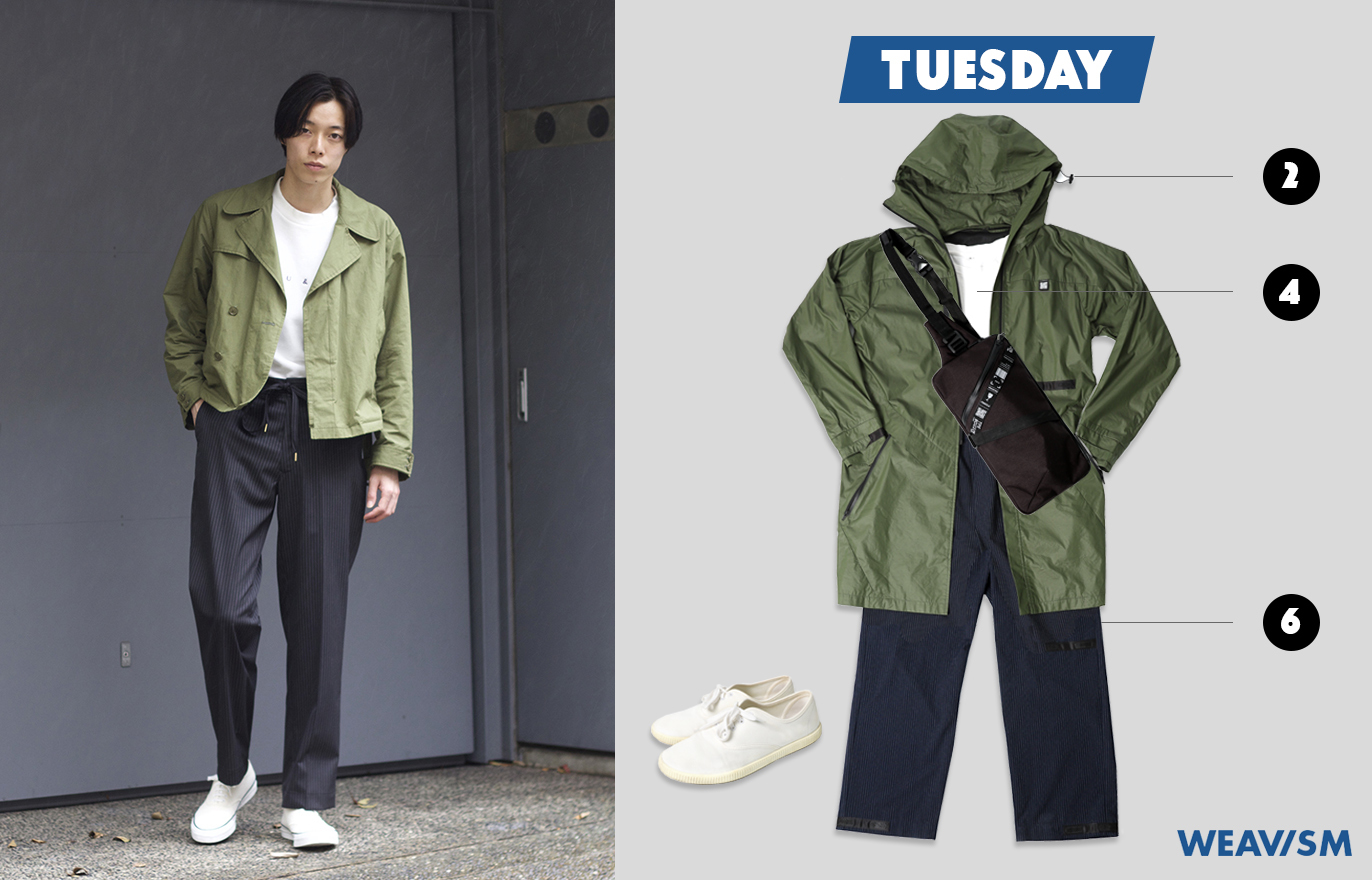 黑條直筒褲是能任意遊走在休閒與正式穿著間的好搭單品,外搭軍綠色連帽風衣增加視覺層次,背後有透氣孔設計,春夏穿也不怕悶熱,不穿時用內裡的織帶收納,可背、可捲、袋著走,隨身物品統統裝進小巧的掛包,俐落不累贅,做個型格 City Man。