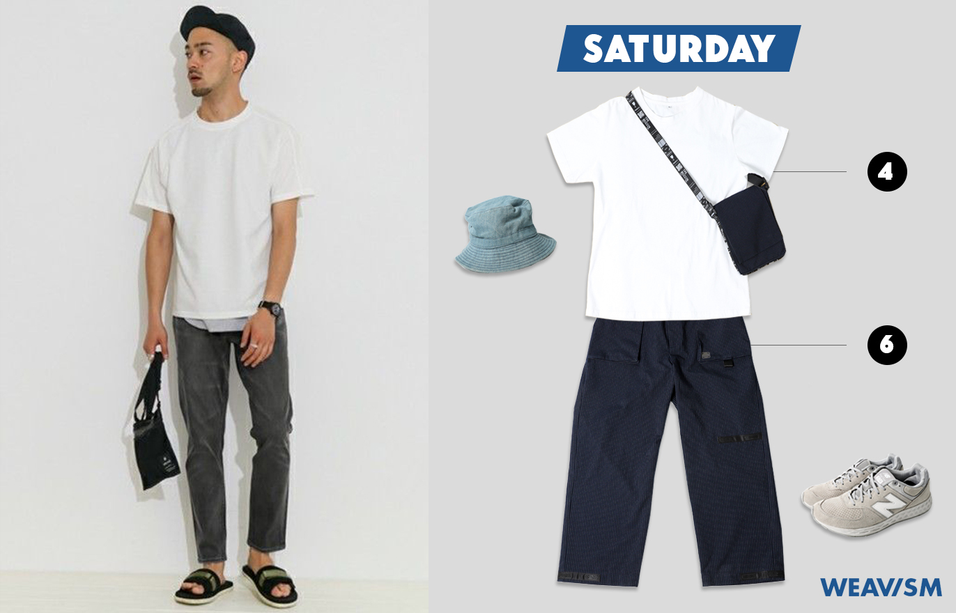 週六的戶外郊遊,用百搭白Tee + 黑條直筒褲 + 斜背小包 + 漁夫帽 創造清爽日系男子風。面對太陽高掛的好天氣,我們推薦搭配這件採用膠原蛋白胜肽纖維製造的白Tee,不僅抗UV、親膚、具水潤感,而且擁有天然消臭功能,讓你出遊一整天依然享受舒適涼感。(帽品改搭棒球帽,會有不同的感覺喔!)