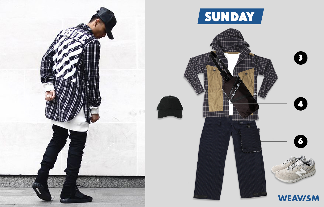 星期日穿上街頭 Style 的格紋穿搭,以看場電影和逛街作為假期的收尾。錢包、水壺放掛包,剩下的小東西們都裝進小書包,運用特殊九字鈎和魔鬼氈掛在黑條直筒褲上,走逛時一點都不用擔心大包小包壞了興致。
