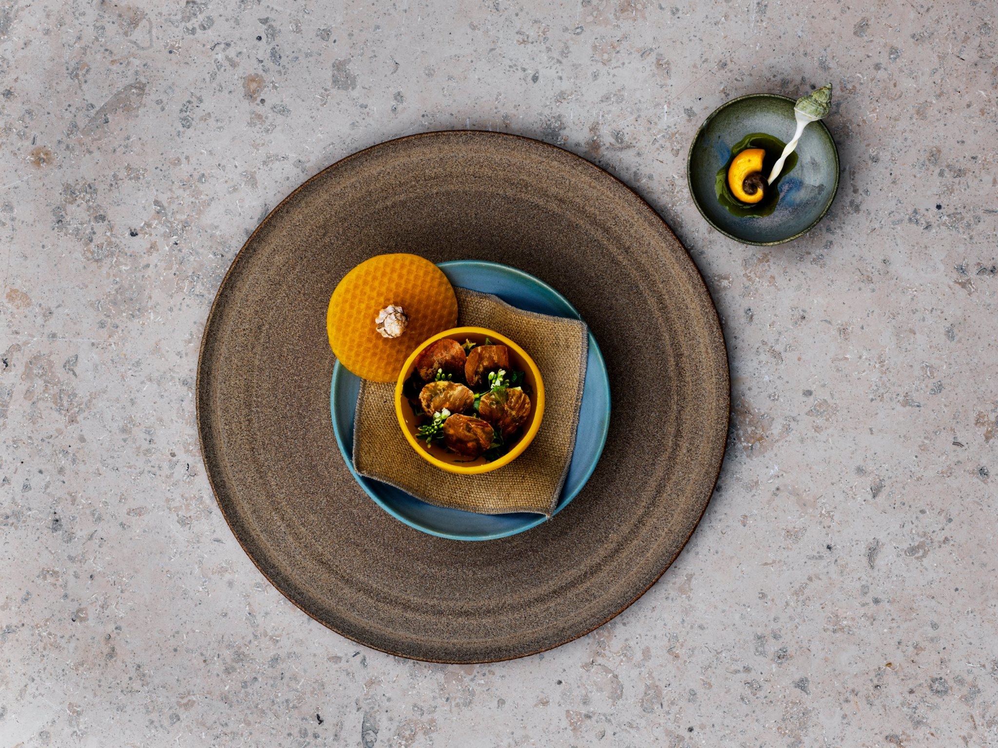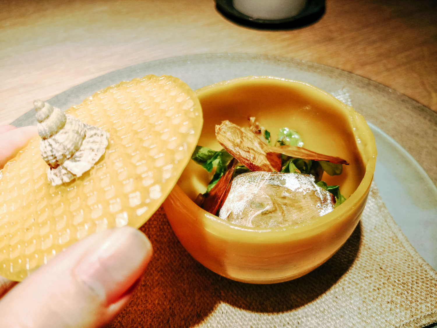 用蜂蠟製成的小碗在開動前就夠牢牢抓住大家的目光了,這種蠟可以保溫但不會完全融化,透過手心的溫度能讓食材和天然蜂蠟的氣味合而為一,湯匙則選用相當搭襯的牛角湯匙,帶來視、嗅、觸、味覺多方位的徹底體驗。裡頭盛裝經過五小時調理、以沙拉方式表現的法羅島海蝸牛肉,結合辣根奶油、乾燥香料和野菜,撒上用海藻水擦拭、帶有一層薄海藻鹽的玫瑰花瓣,肉質軟嫩鮮美。
