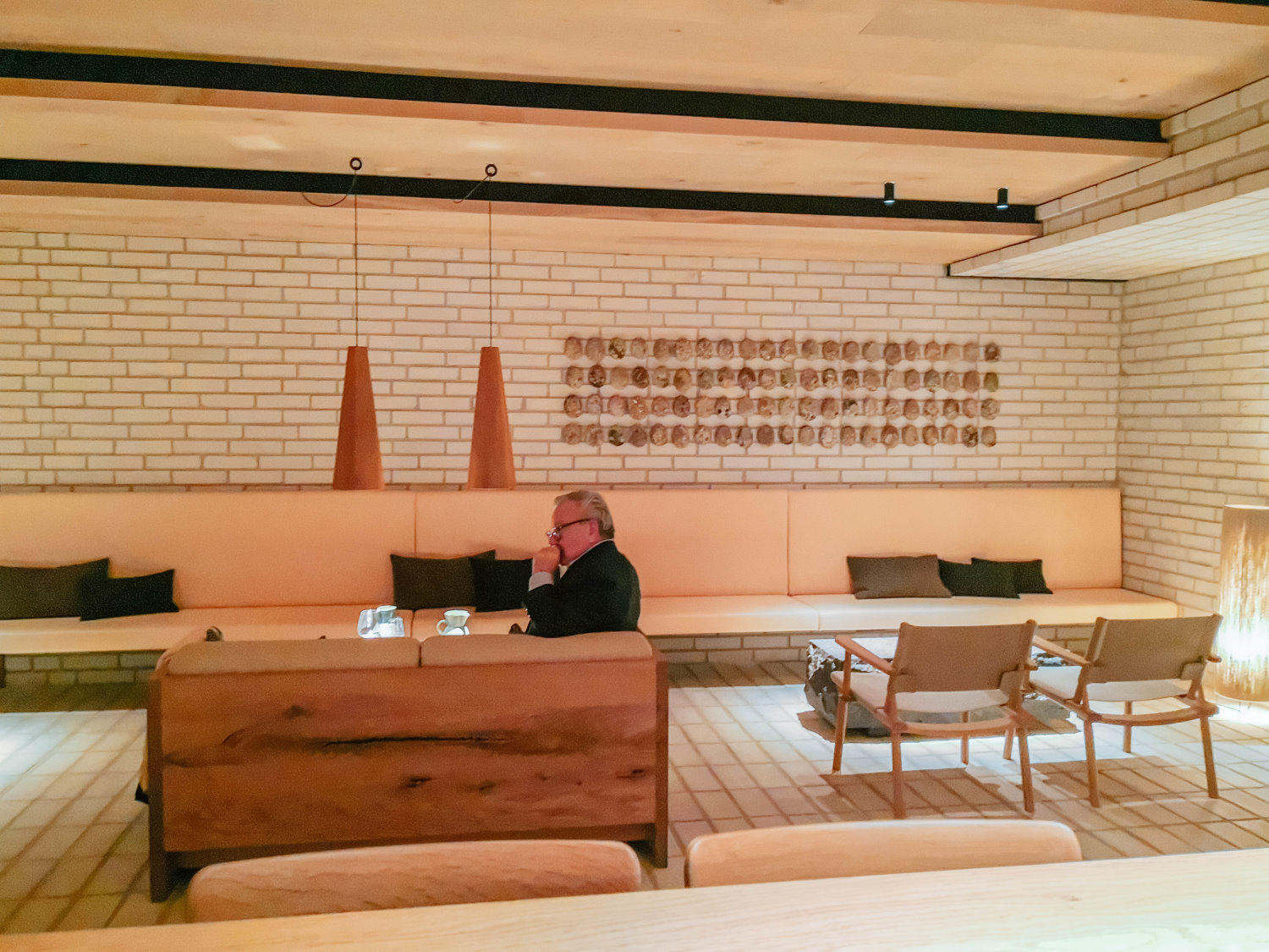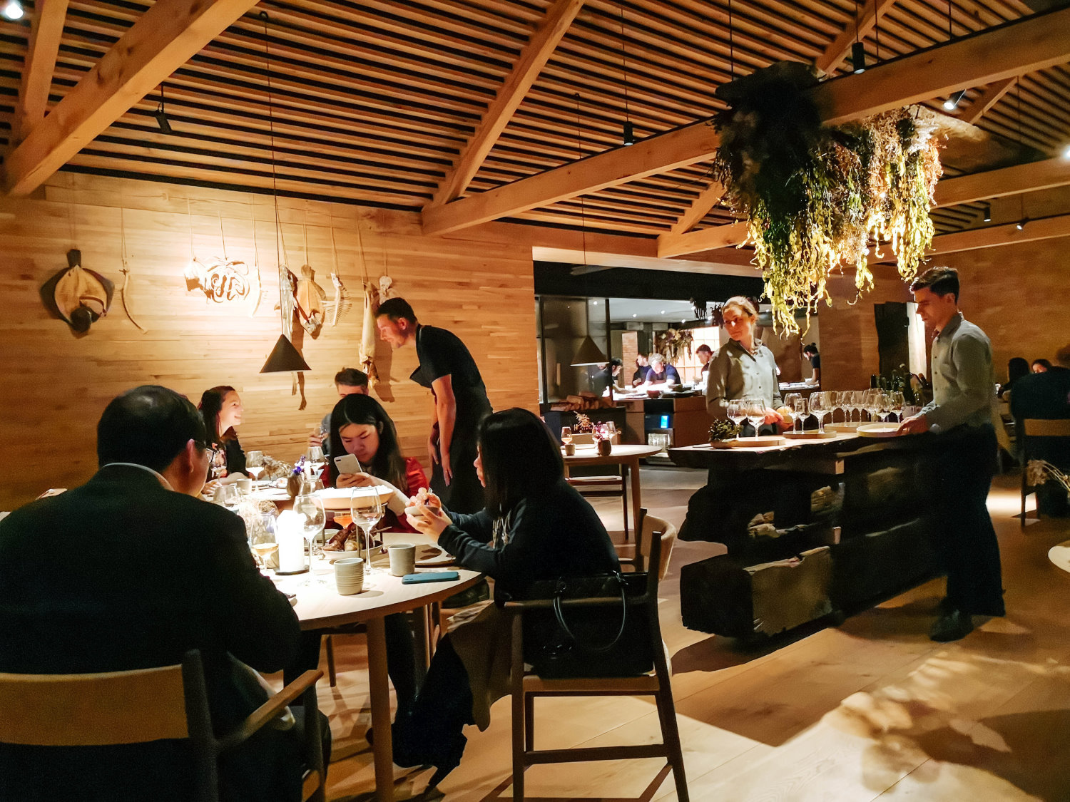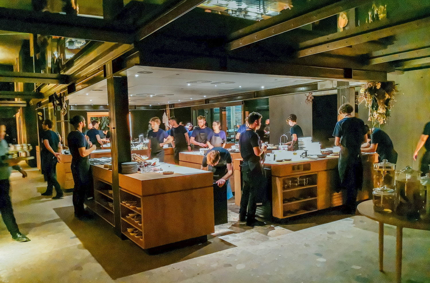 新 noma 基地由11棟建築物構成,包含溫室、發酵實驗室、大花園等不同功能的區域,朝餐廳建物行進的路途,會先經過一座座建構中的溫室,周遭環境非常寧靜。餐廳以開放式主廚房為中心,分別區分主用餐區和享受飯後甜點的 Lounge bar 區域;有趣的是,這裡的顧客座位區只有 40 個左右,卻有約百位廚師、研發人員和服務人員在此服務、進行食物實驗,可以說是在一座高階實驗室裡用餐,也能看出 noma 對服務水準和餐點品質的極度重視。
