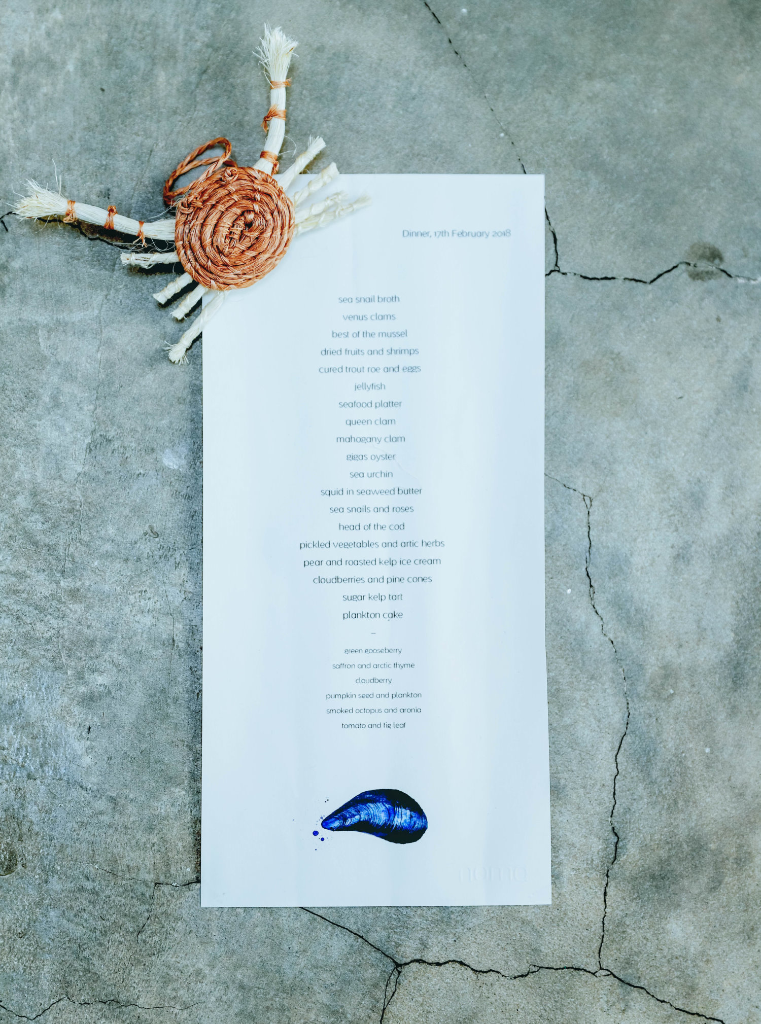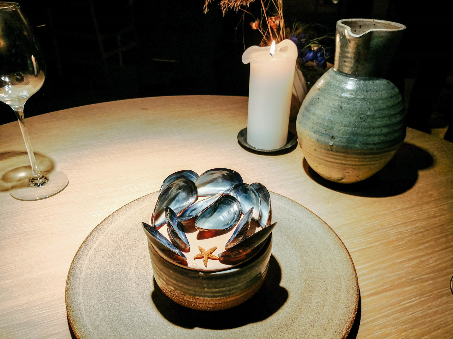 noma 團隊把丹麥西部的藍貽貝蒸煮並切割成片,剩餘的貽貝肉用煙燻奶油混合製作成美味醬料搭配食用,處理手法讓這個常見的食材變得與眾不同;廢棄的貽貝殼經過排列、加上海星點綴,就成了值得玩賞一番的碗蓋。