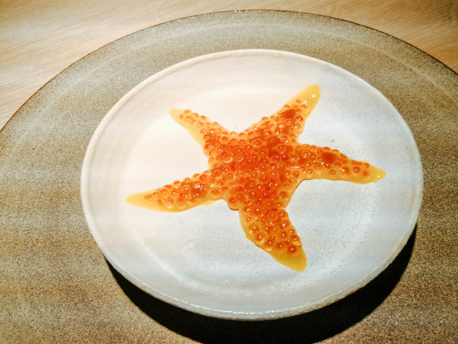 醃製鱒魚卵以蝦膏、蛋黃醬汁呈現出橘黃色的海星形象,上方撒上一些口感清脆的脆李,滿口海的鮮甜而沒有常伴隨而來的腥味,相當清爽。