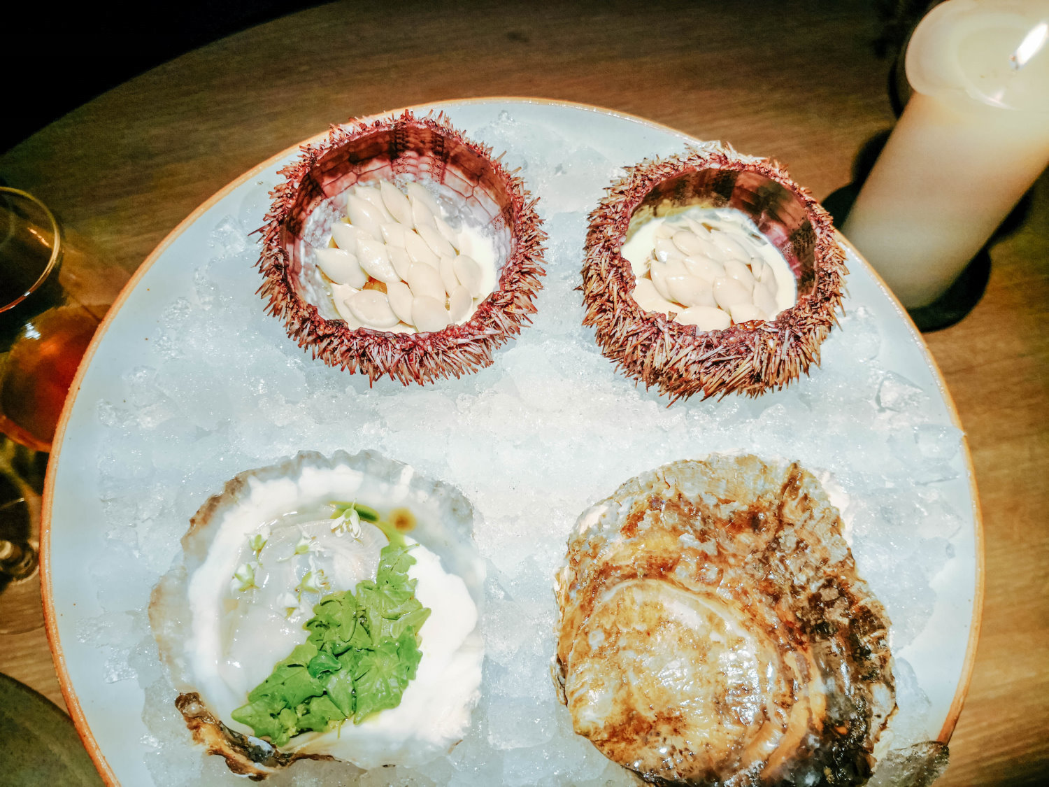 由女王蛤蜊、牡蠣和海膽、乾海參等組成的海味拼盤,其中海膽上方佐以生南瓜籽,並淋上用鮮奶油和玫瑰油打出的醬料,帶出海膽的甜味和香氣,非常突出!另外,其中一道蛤蜊佐莓果竟然是用蟶子 (蟶,讀音ㄔㄥ,一種海產貝類)的空殼當作挖取的餐具(輪播圖三),真的很有創意!