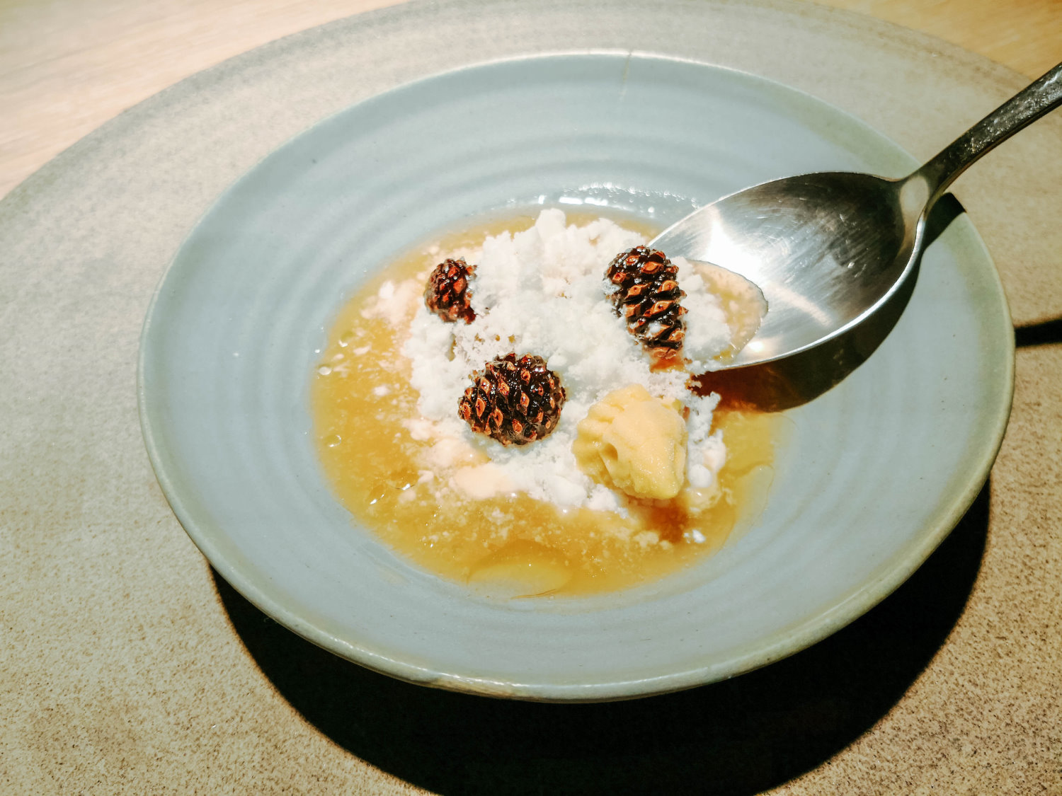 沒想到松果這個想像中只會用在薰香、家具的素材竟可以直接入菜,糖煮松果吃起來像軟木塞,卻帶來滿口松香,而被處理得像雪花冰的雲莓,入口即化,簡直像在吃一朵雲,是迷人又難忘的一道甜品。