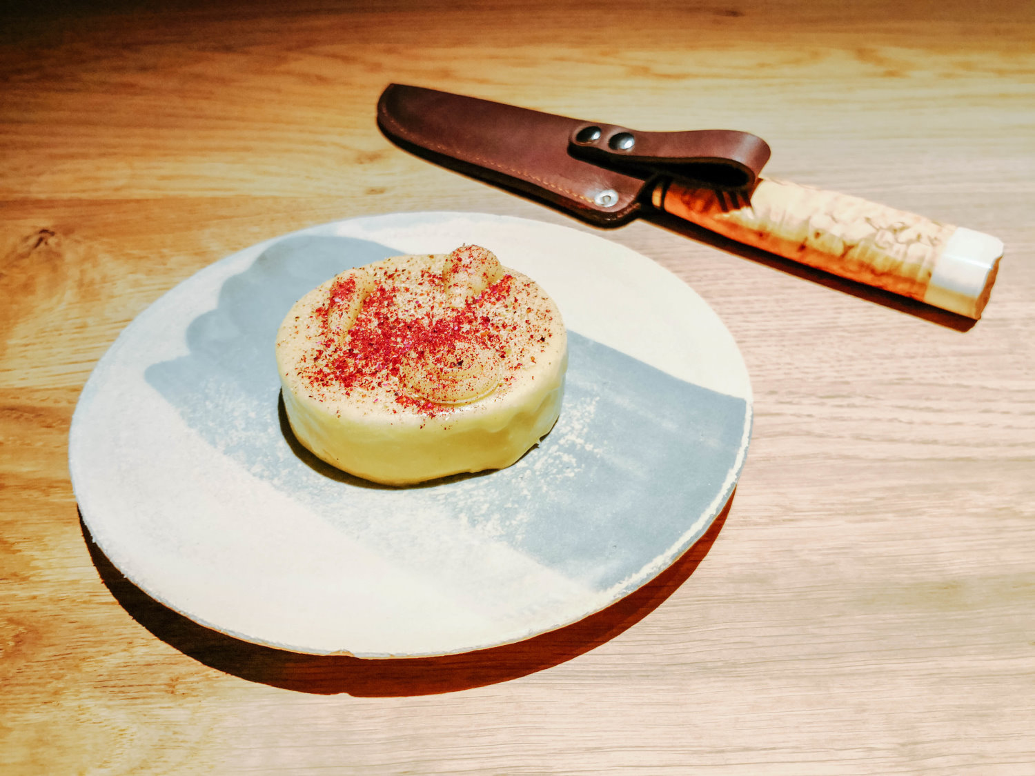 沒想到吧?慕斯蛋糕也是加入浮游生物做的!noma 附上精緻的匕首讓你動手切分,空氣感、綿密的慕斯蛋糕外層包覆奶香濃厚的鮮奶油,上方佐以莓果的酸甜中和整體口感,又是一道綜合土地和海洋口味的奇特組合。