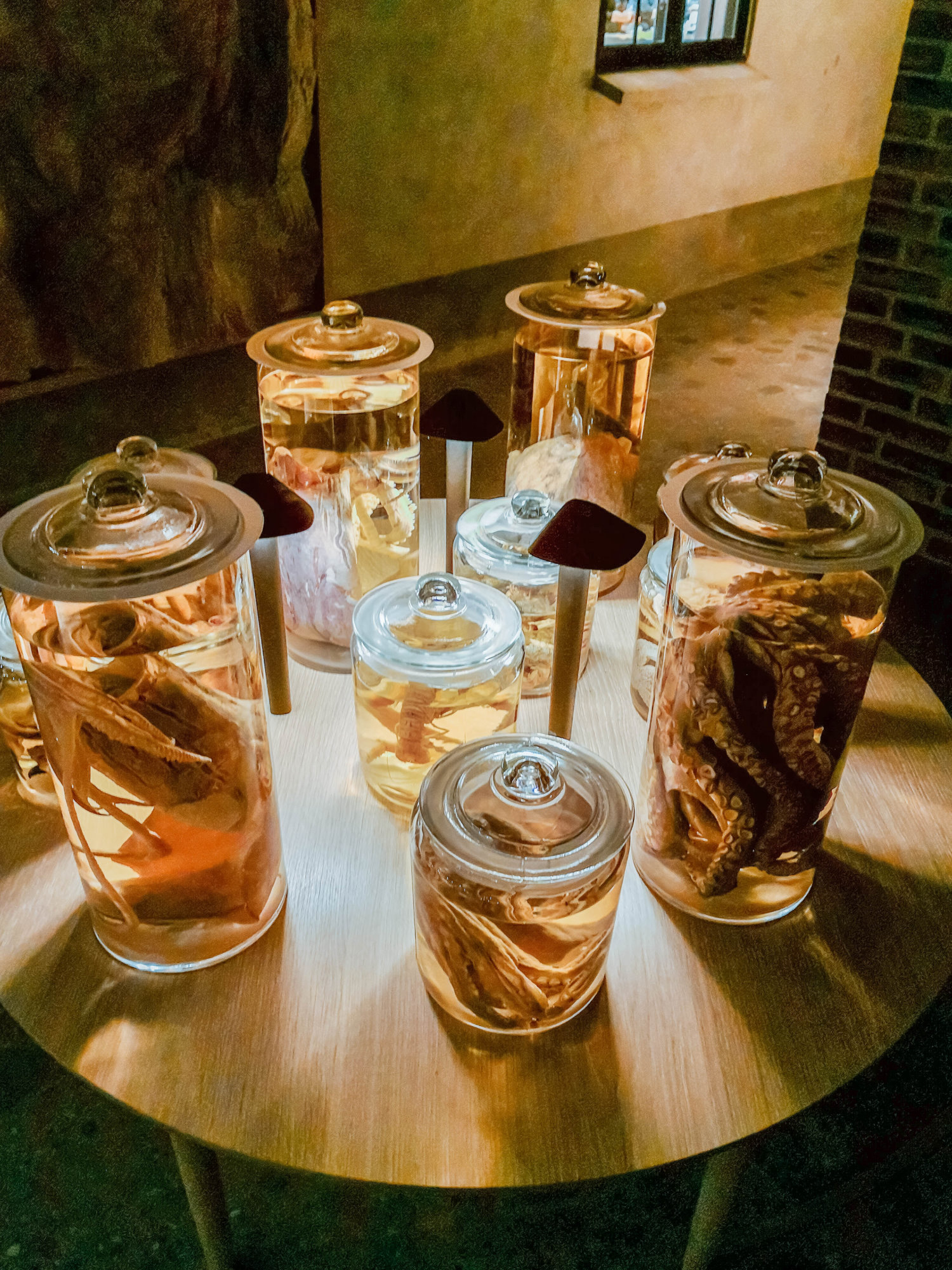 導覽過程裡,可以看到許多如科技實驗室才會出現的器材,玻璃上亦寫滿研究人員的記事 — noma 不惜成立 Research & Development 和發酵實驗室,將食物開發視為幾個月、甚至數十年的研究歷程,同時養殖許多動植物卻備而不用,為的是在靈感來臨時得以隨時嘗試,幾乎是用瘋狂的熱情看待料理這門藝術,不僅不斷打破固有思維,更將料理推向了讓人難以想像的高度境界。