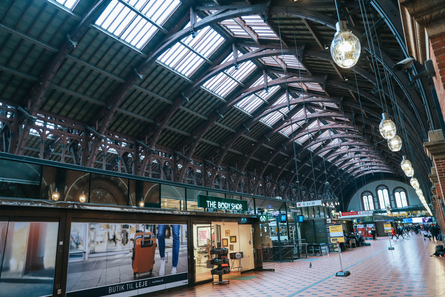 哥本哈根中央火車站(丹麥語 Københavns Hovedbanegård,簡稱 København H)是丹麥最大火車站和重要交通樞紐,從哥本哈根機場可以直接轉乘火車抵達。車站建造於1911年,紅磚黑瓦的建築風格古典優雅,但內部的自動售票機、商店街、餐廳等現代化服務一應俱全,大廳內保留的拱頂、老吊燈和歐風地磚也很有看頭,是古典和現代結合的絕佳案例;順帶一提,車站外頭也有許多熱狗餐車,務必要吃看看道地的丹麥街頭美食!(參考北歐餐館美食篇)