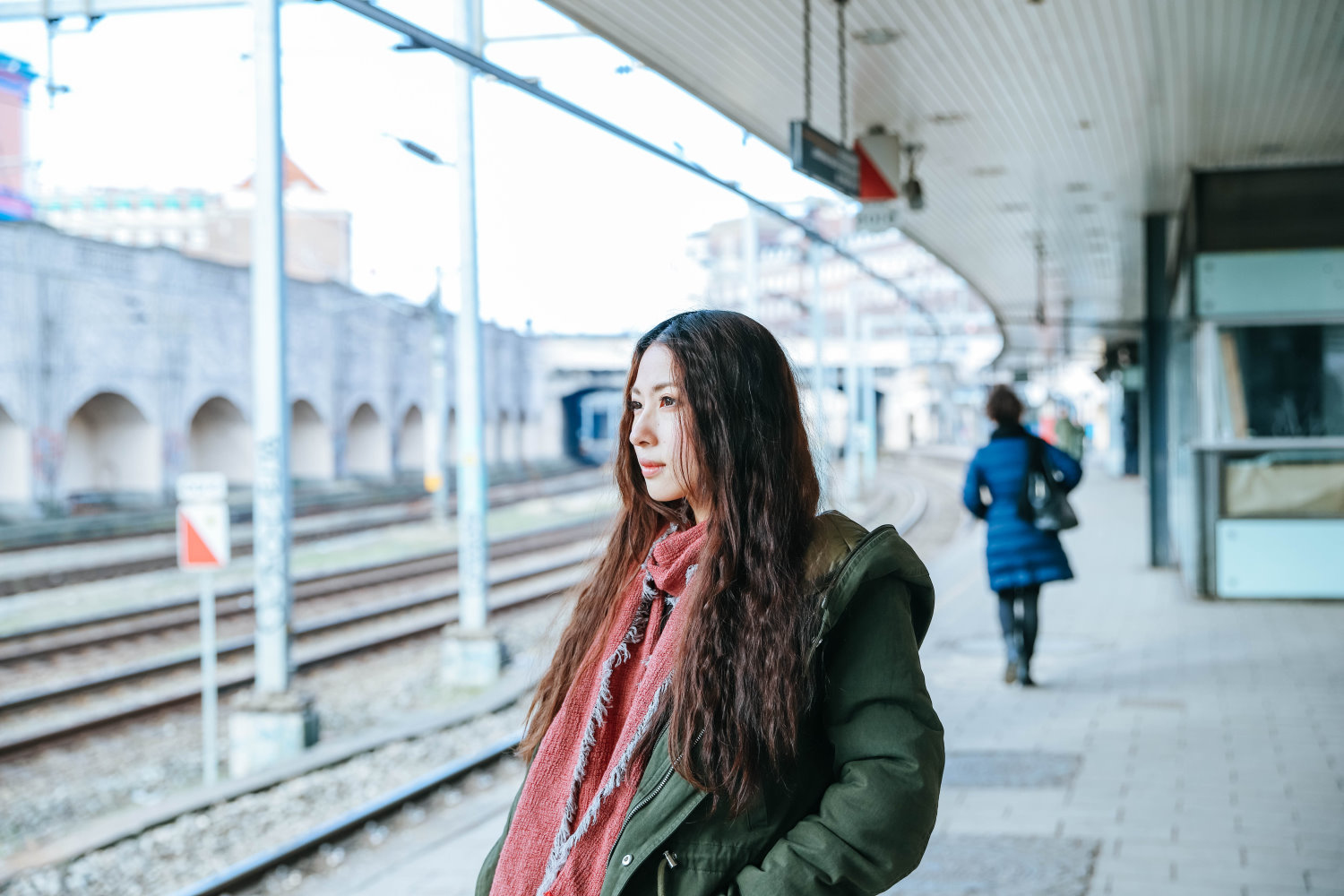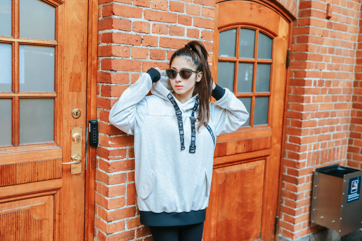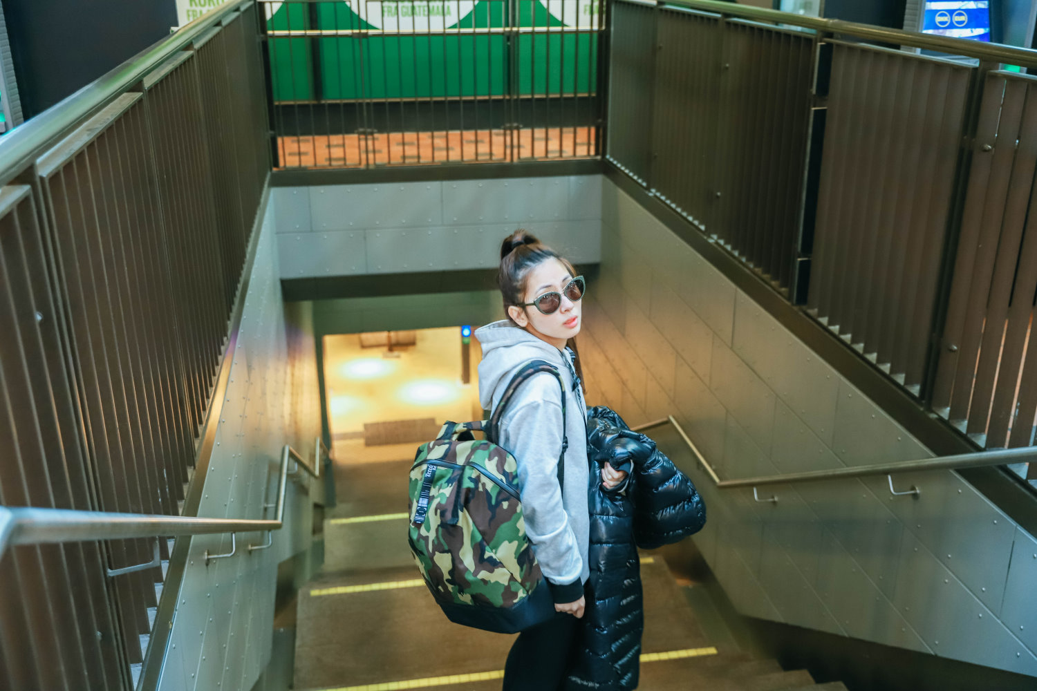 看起來像是厚棉 T 材質的拉封裝,其實是舒服的針織材質,車站裡的溫度恰到好處,穿上這件厚度適中的連帽上衣就很足夠,步出室外時可以運用 WEAVISM 織帶搭配快速調節環,迅速戴上帽子並調整鬆緊,不怕大風吹襲。WEAVISM 袋袋相傳後背包亦是 TC 和 Angela 旅行必備,極輕包身(不到 600克)是採用防潑水、抗撕裂的高密度 CORDURA® 纖維製造而成,同時可以隨需求加掛獨立小包,極為便利。
