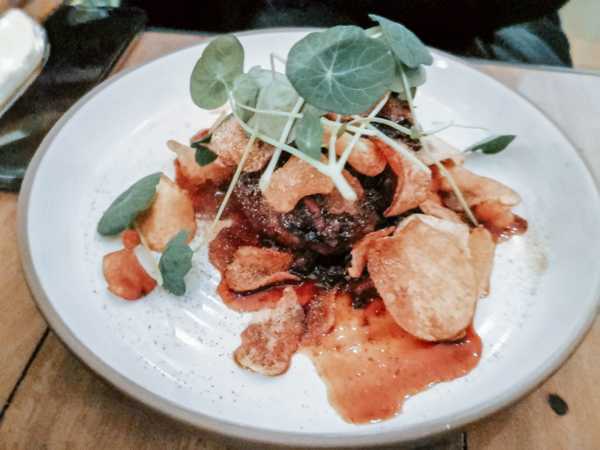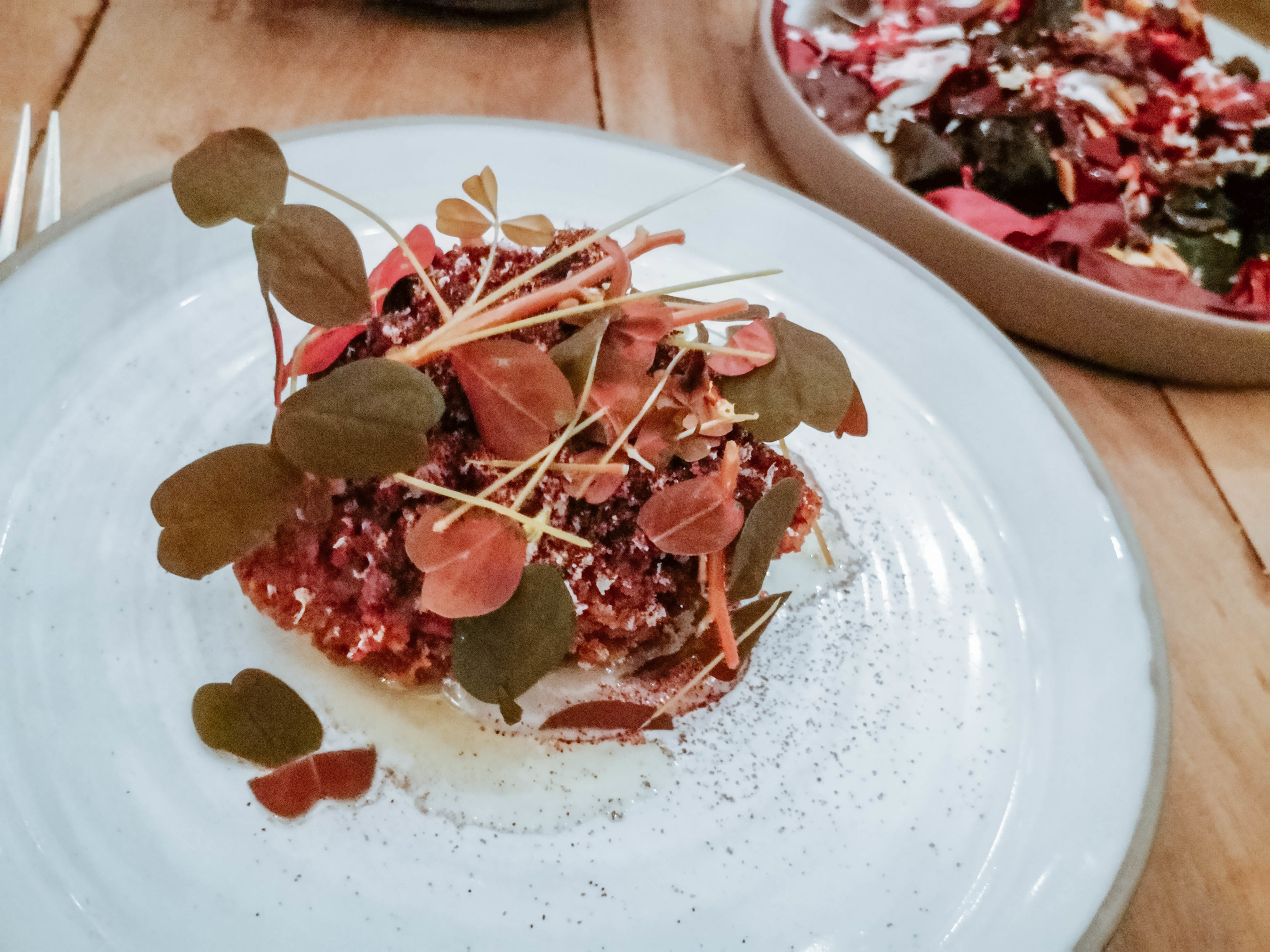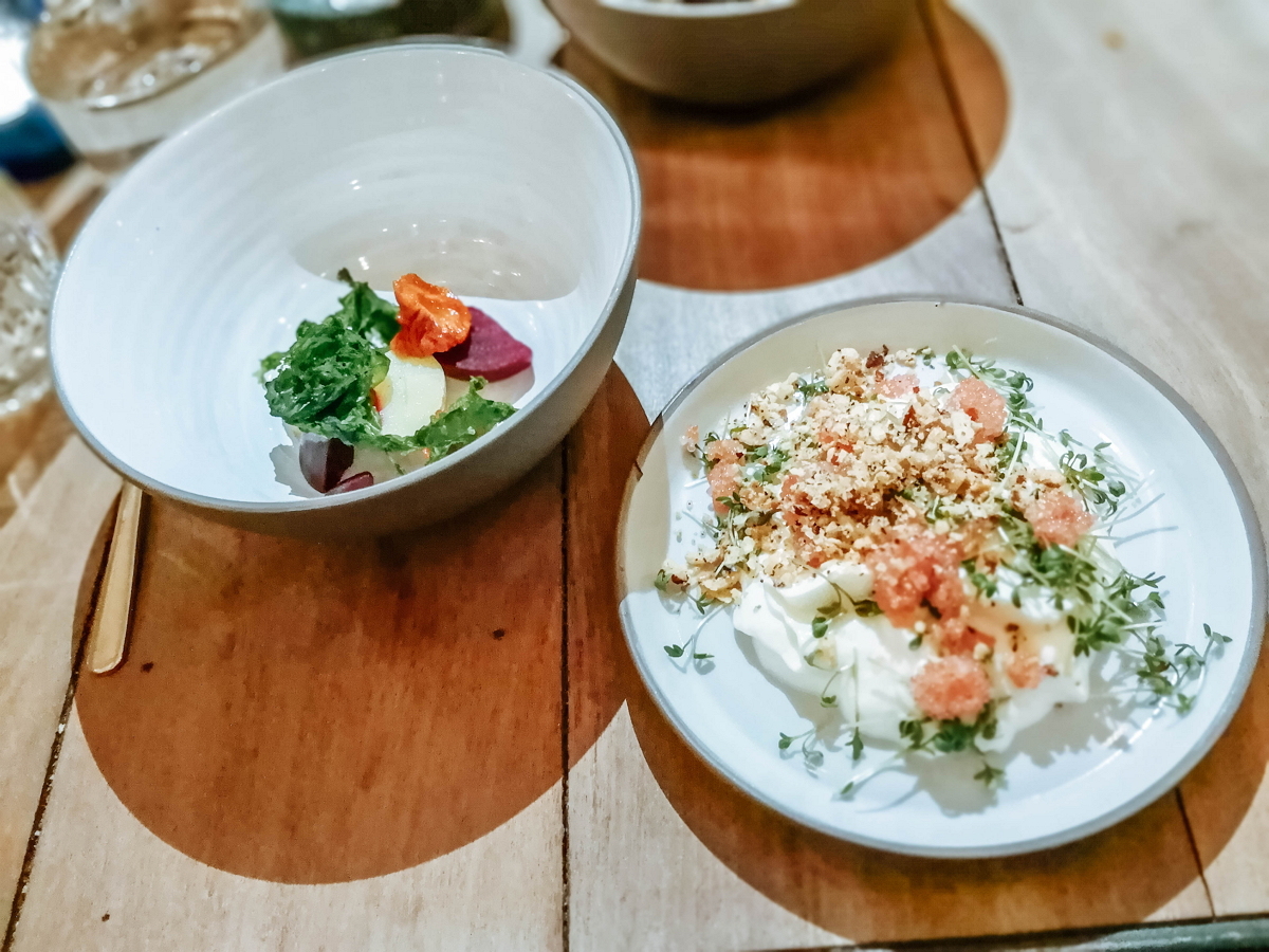 因為在晚上前往,很可惜比較沒法拍出像餐廳官網一樣採光明亮的照片,但還是要和各位分享這家被我們歸類為夢幻系餐廳的料理。雖然專注於打造北歐蔬食,但在 Väkst 還是吃得到肉類料理的!前菜混合了起司打的鮮奶油加上脆片,搭配新鮮鮭魚肉,一旁附上稍微經過脫水處理、有蔬果乾口感的天然野菜,是海與陸的清新融合。