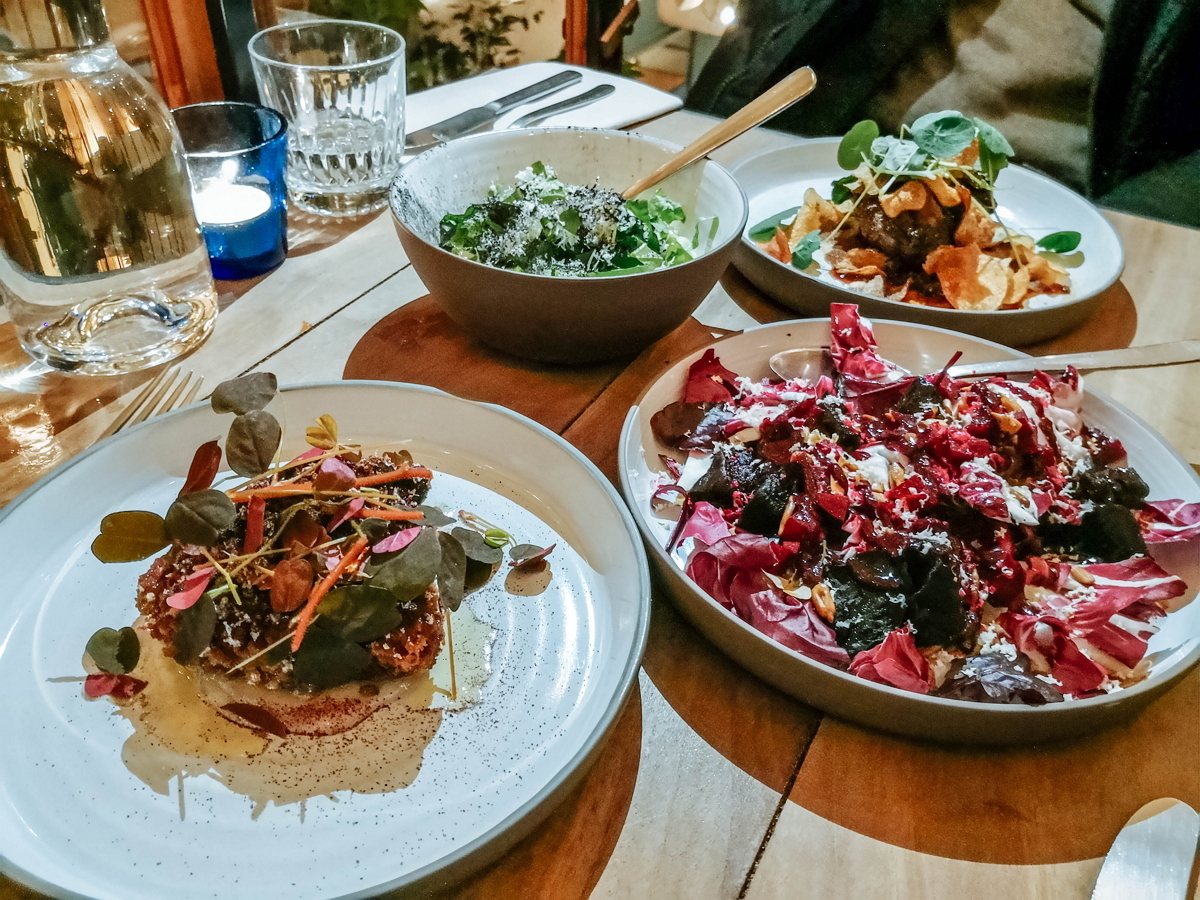主菜分別點了西冷牛排和伊比利豬排,牛排與馬鈴薯薄片搭配,配菜佐以鮮甜野菜與輕盈綿密、帶著奶油香氣的薯泥;豬排則可以榮登目前吃過的豬排中的第一名!炸粉別出心裁地加入燕麥和穀類,包裹著肉質軟嫩的豬排,整體口感更酥脆、更有層次,搭配加入莓果和堅果的紫色甘藍沙拉,清爽不油膩。