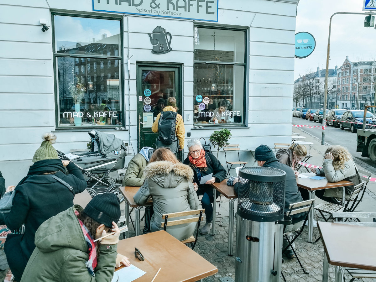 Mad & Kaffe 是哥本哈根知名的早午餐咖啡店,戶外座位區坐滿了正在候位的人們。