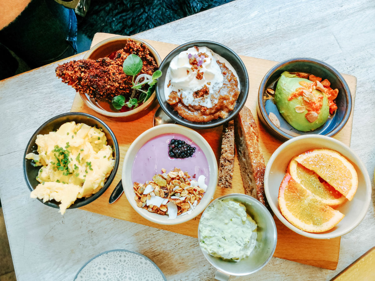 由左上到右下分別是:炸雞、Øllebrød 粥、酪梨配辣椒油和烤杏仁、 有機炒蛋、藍莓優格佐穀麥和莓果、自家製麵包佐奶油乳酪醬、柳橙佐薄荷糖。