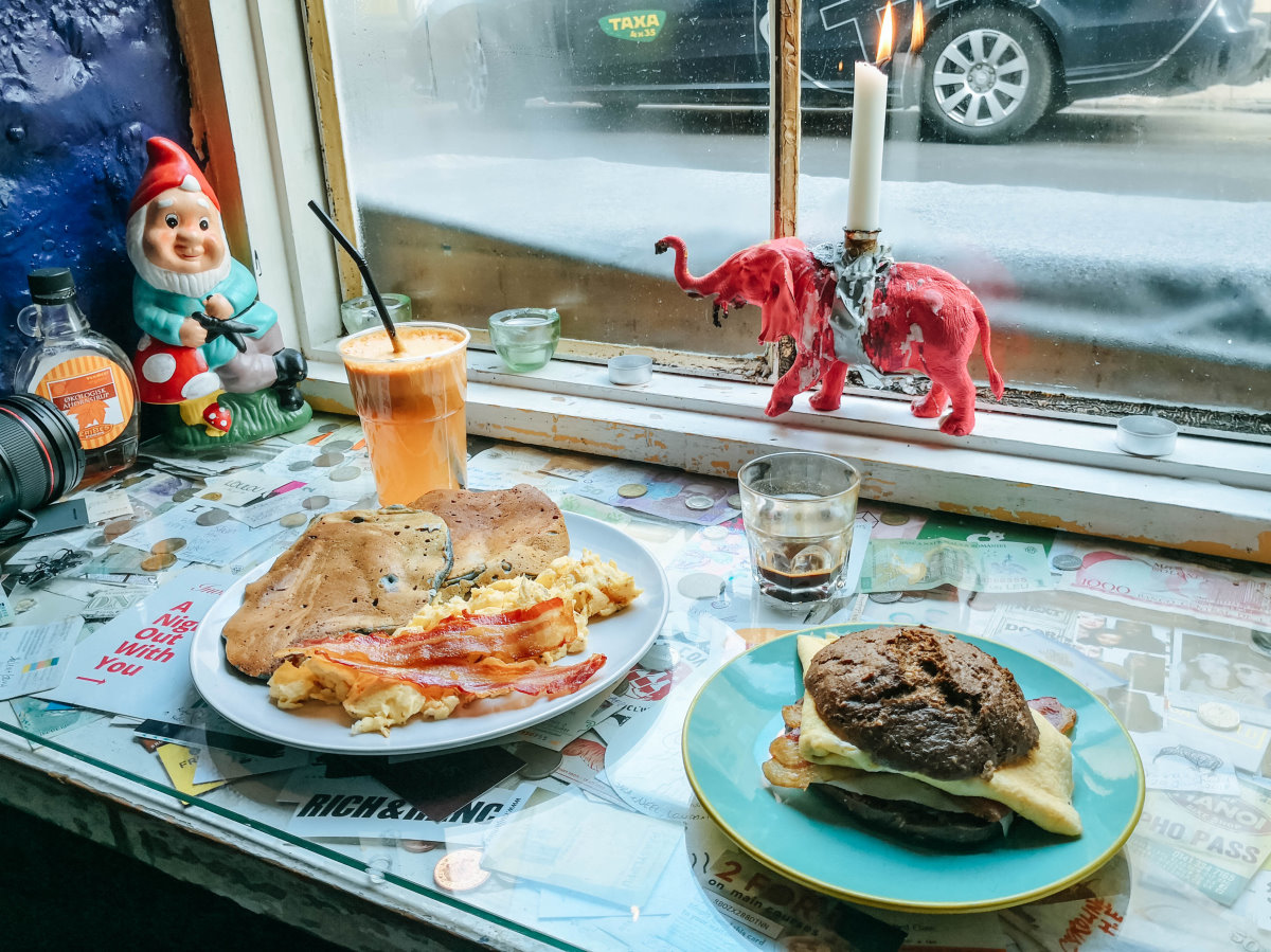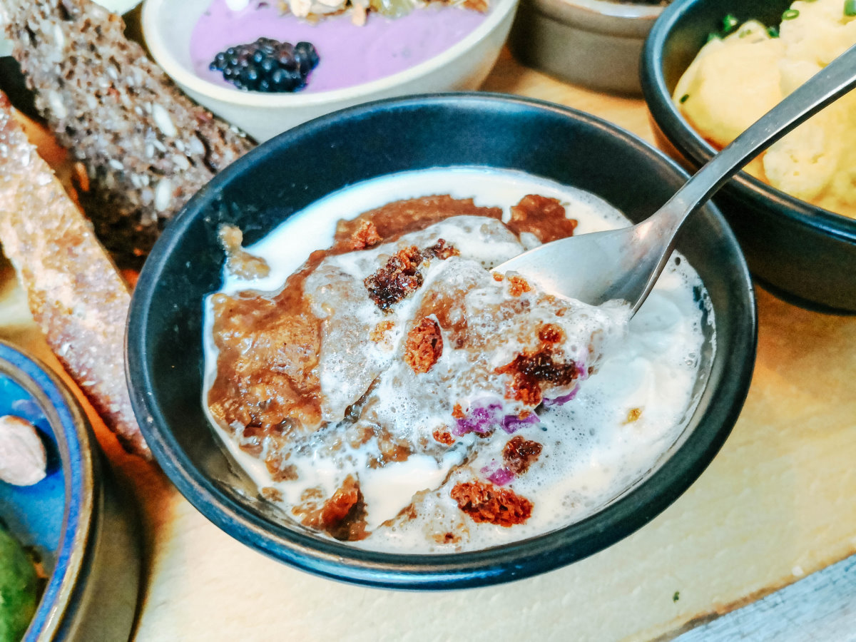 顏色看起來像是奶酪配上奇特咖啡色醬汁的食物,是一種由黑麥麵包和啤酒製成的丹麥黑麥麵包粥,稱為 Øllebrød ;柳橙則灑上了薄荷糖,在酸甜中增加了清涼的口感層次,藍莓優格佐穀麥和莓果的顏色很討人喜歡,也讓這家店成為 instagram 上的人氣拍照店家。