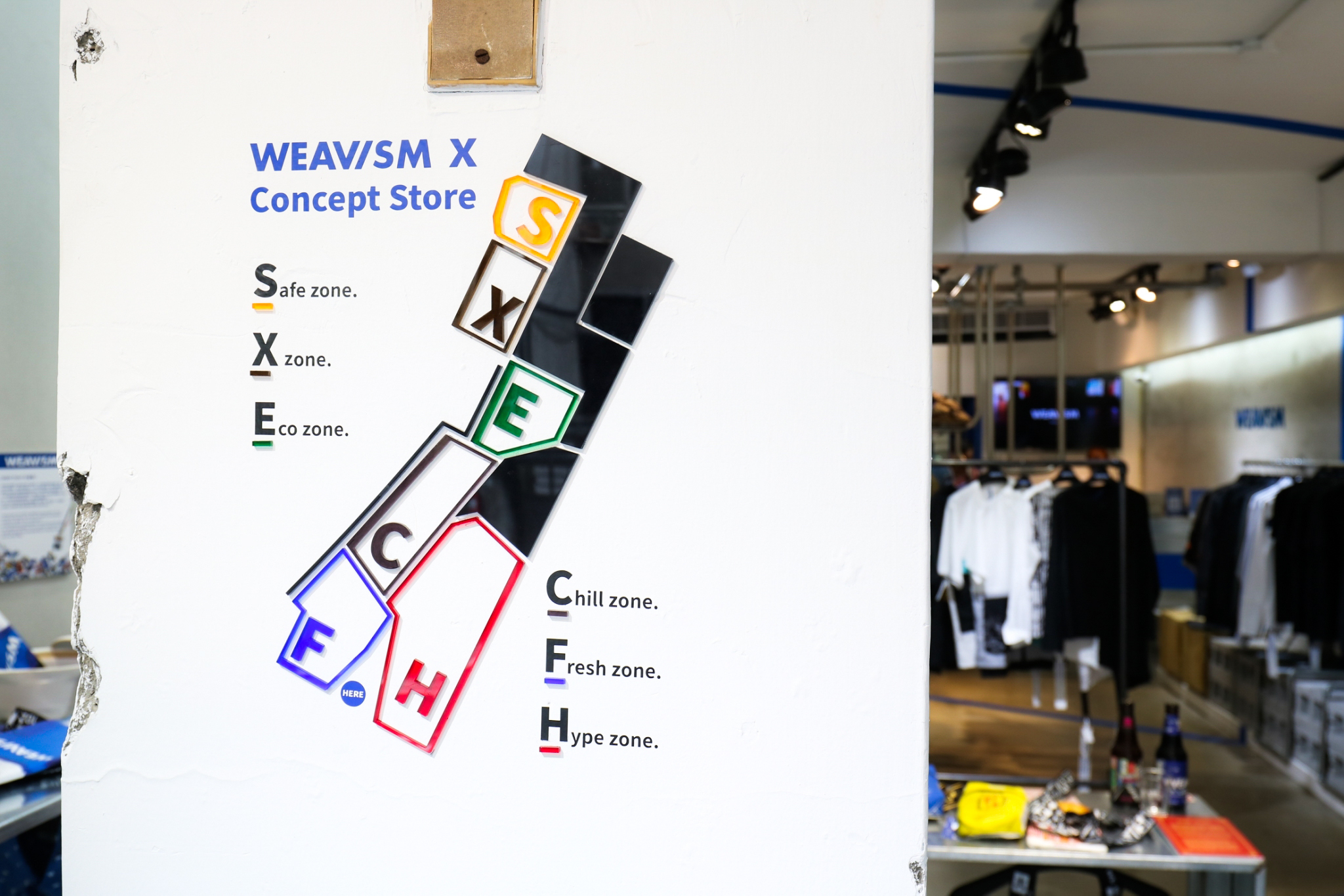 WEAVISM X的概念並不是打造一個新的服飾店,而是打造一個貫穿持續實驗以及體驗的一個空間,能與 WEAVISM 的顧客們能保持更緊密的互動。店內被劃分成六個區域,展覽述說各自獨立又互相關聯的故事: Hype Zone,Fresh Zone,Chill Zone,Eco Zone,X Zone與Safe Zone。