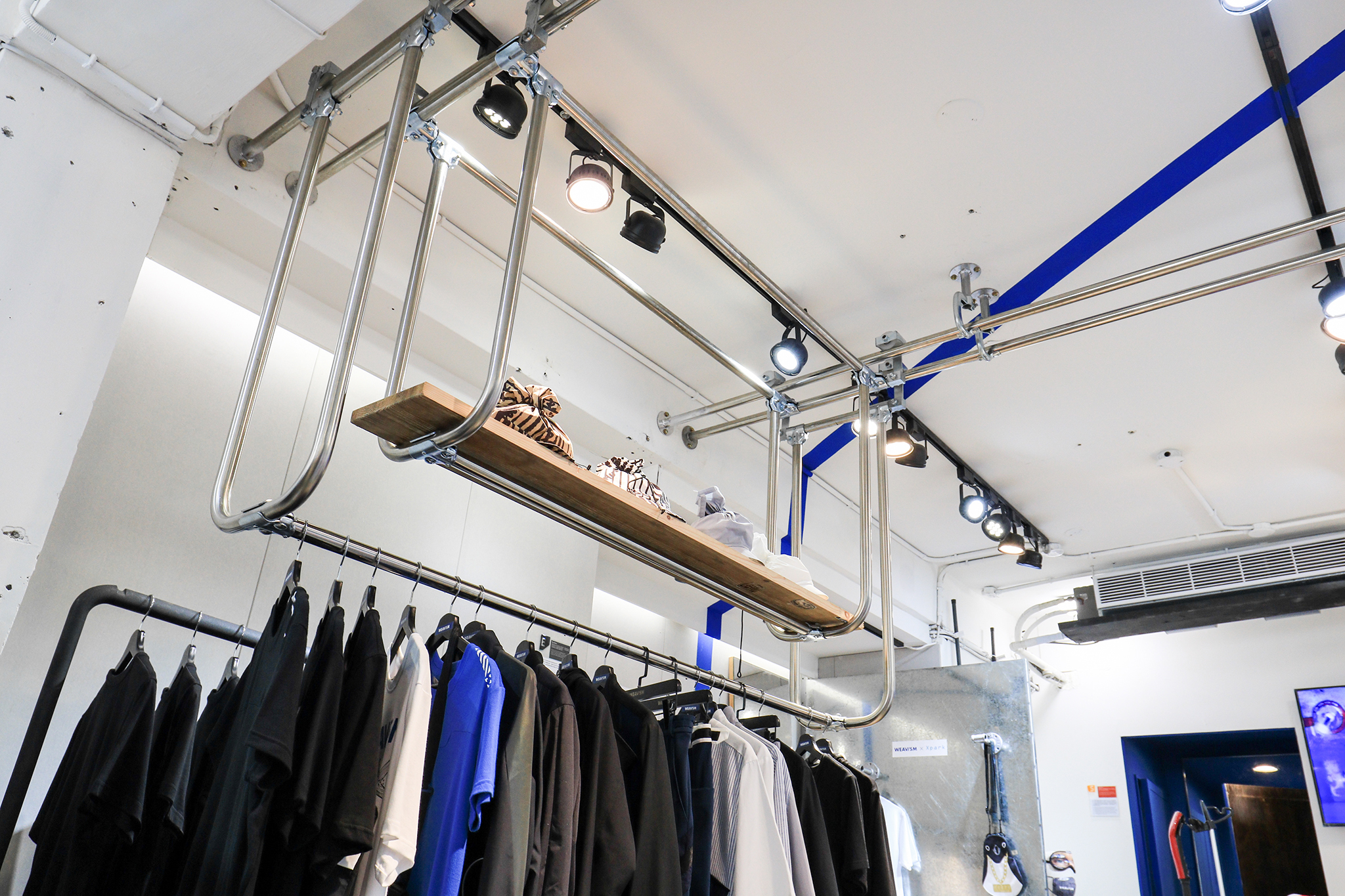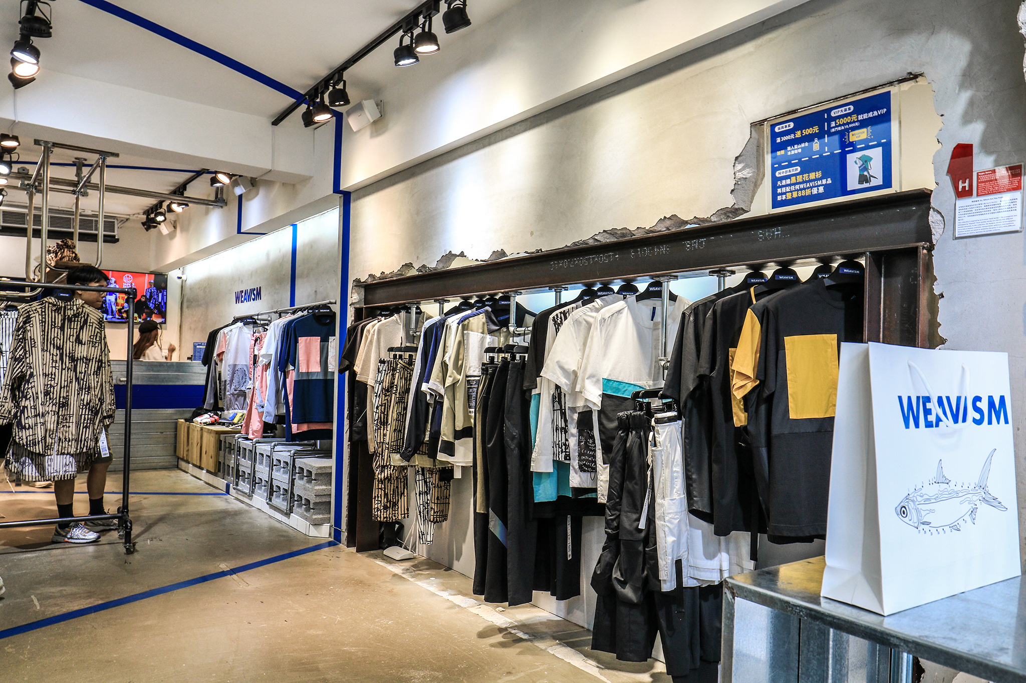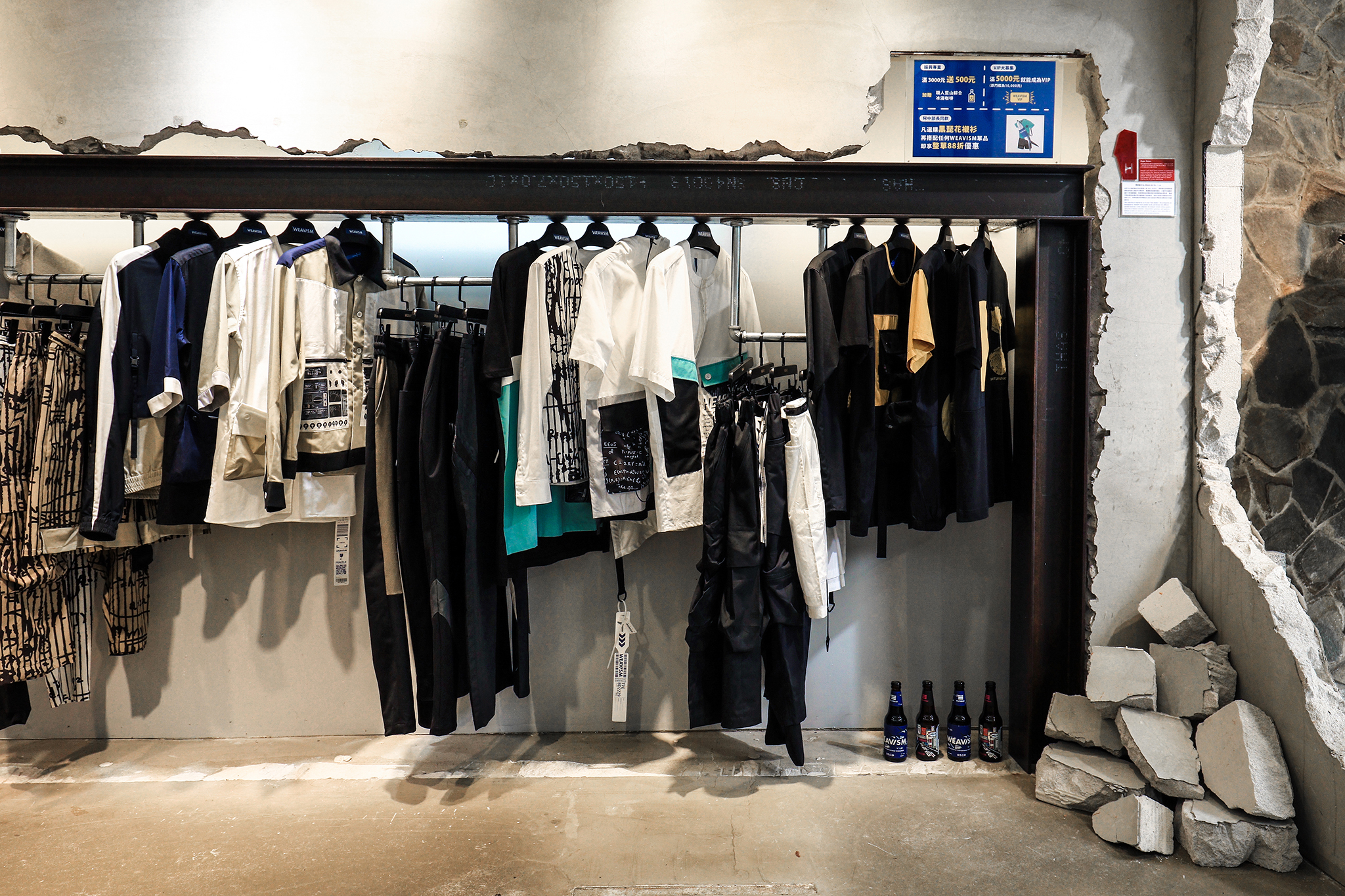 破碎的牆崁入H型鋼條搭配磁力衣架,讓服裝呈現一種懸浮在廢墟的樣貌。此區呈現的是織本主義當季較潮流的單品。