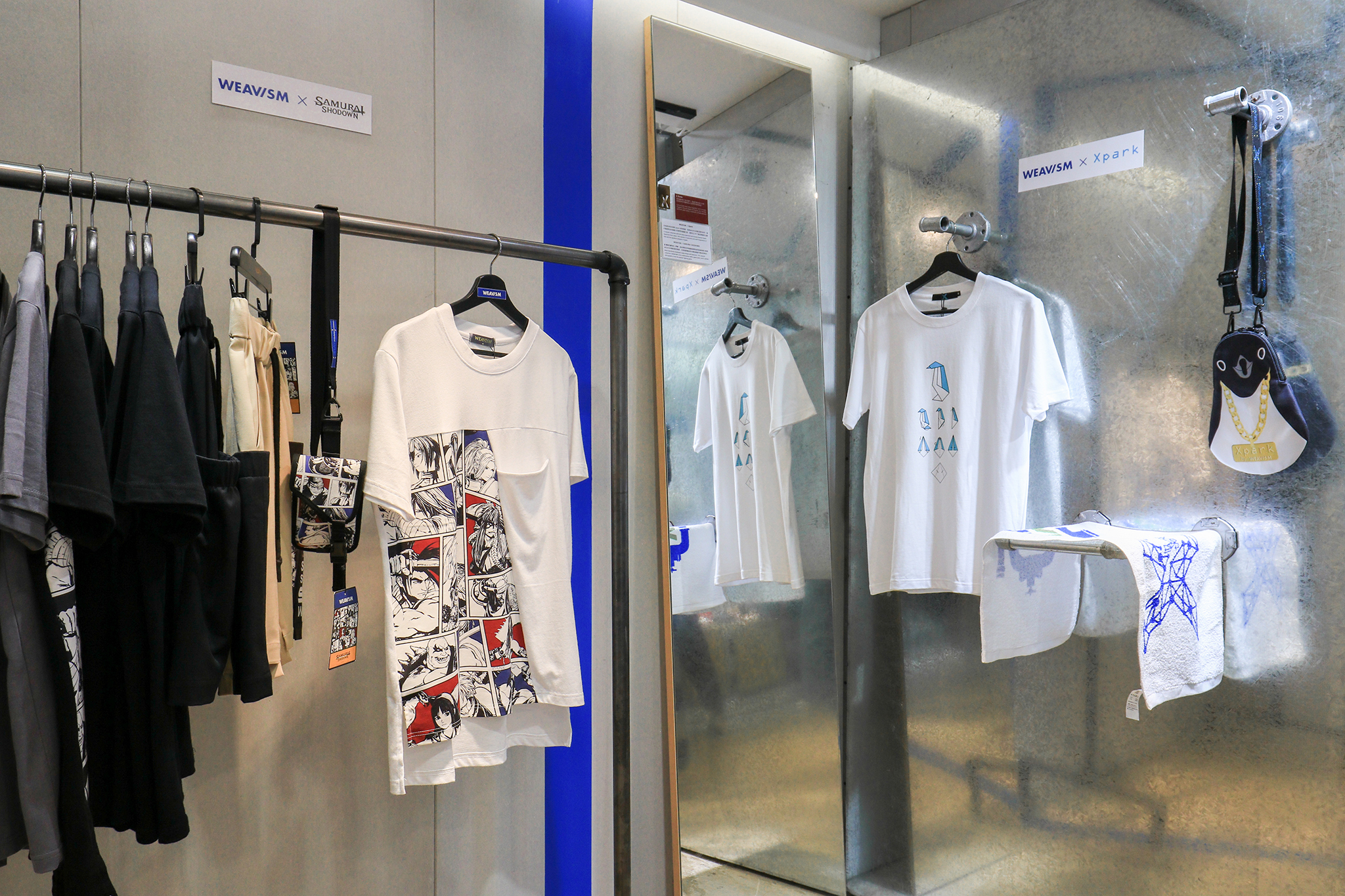 使用鍍鋅板打造的鐵門,透過改裝的磁力水管,呈現織本主義的限量商品以及跨界的聯乘單品。最新作品是與源自日本的桃園Xpark水族館打造的聯名企鵝包,T shirt,以及毛巾;以及攜手日本經典遊戲侍魂Samurai Shodown的限量時裝和配件。