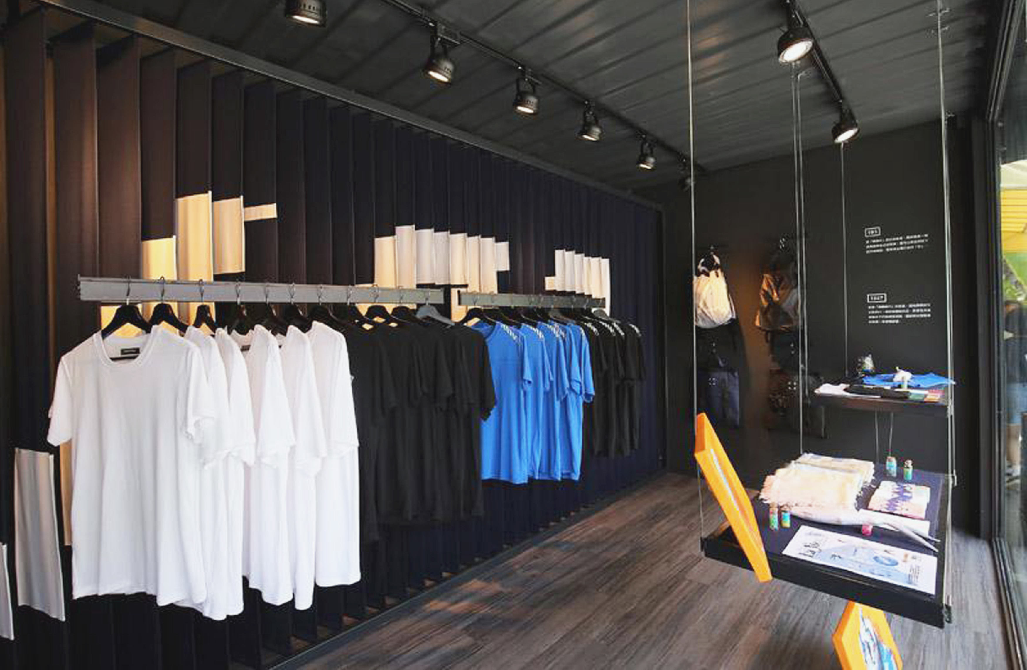 貨櫃屋設計以膠原蛋白布料排列成斑馬線,營造一邊逛街一邊壓馬路的趣味感之外,還能近距離接觸到布料的質地,也增加了一些文化的洗禮,現場同時開放不同款式的膠印圖騰可以提供給顧客做服飾客制化的設計,讓你來台南不只吃虱目魚,還可以把虱目魚穿上身。