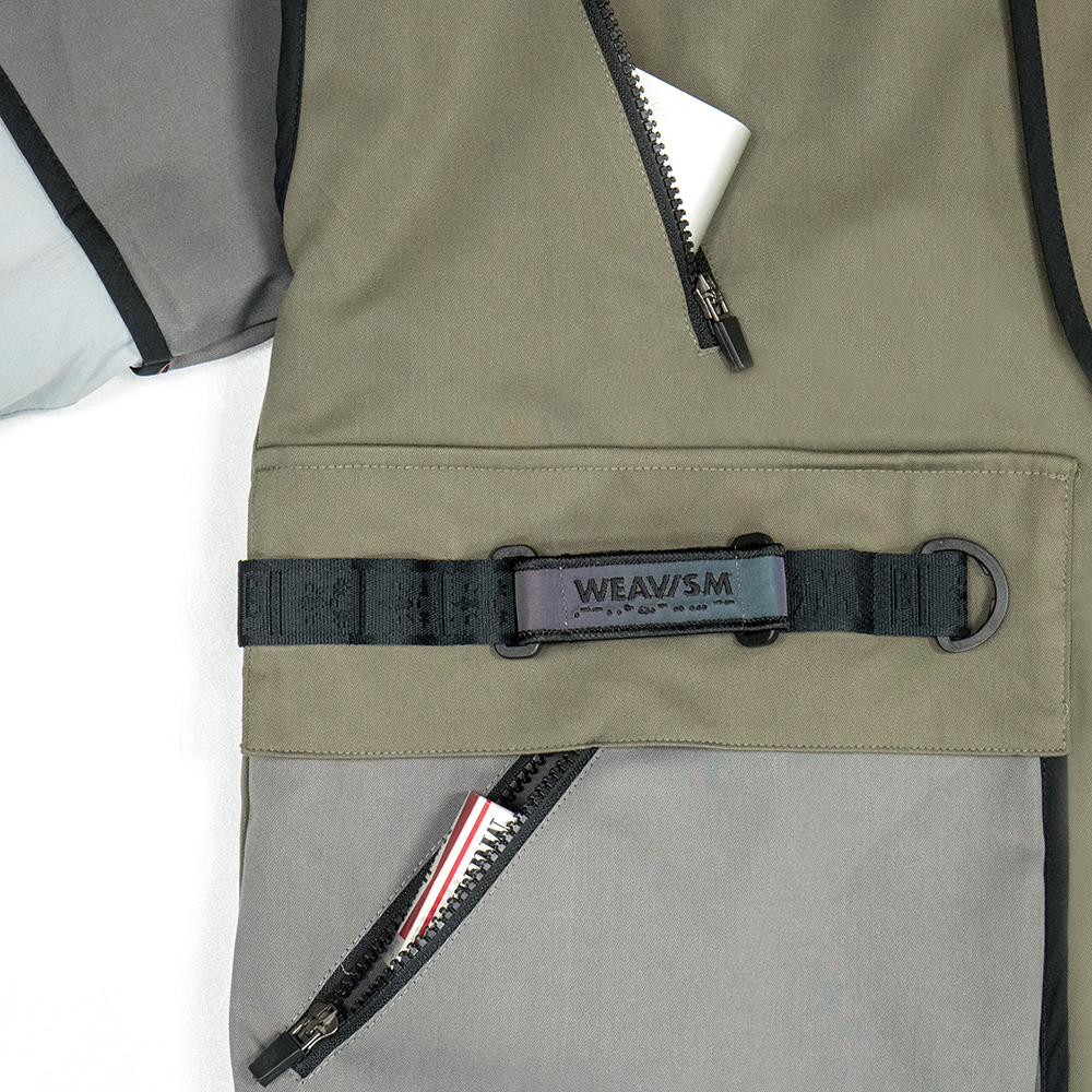 立體刺繡搭配由極細玻璃珠建構的反光基底,識別勳章還可拆卸再扣在其他單品上。
