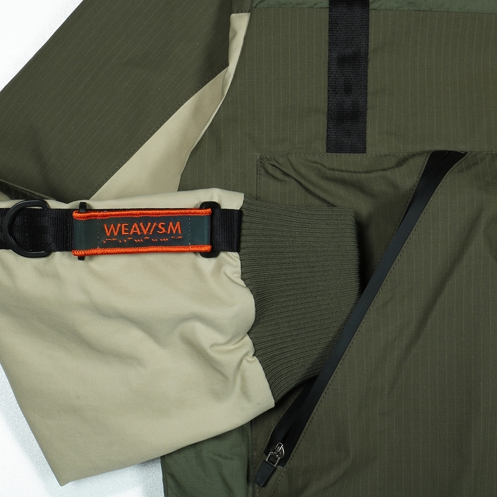 夾克採用色塊拼接設計,並搭配 #防水拉鍊,而口袋的收納空間極大,甚至可以放進Ipad。