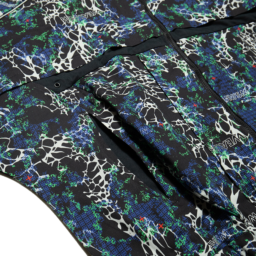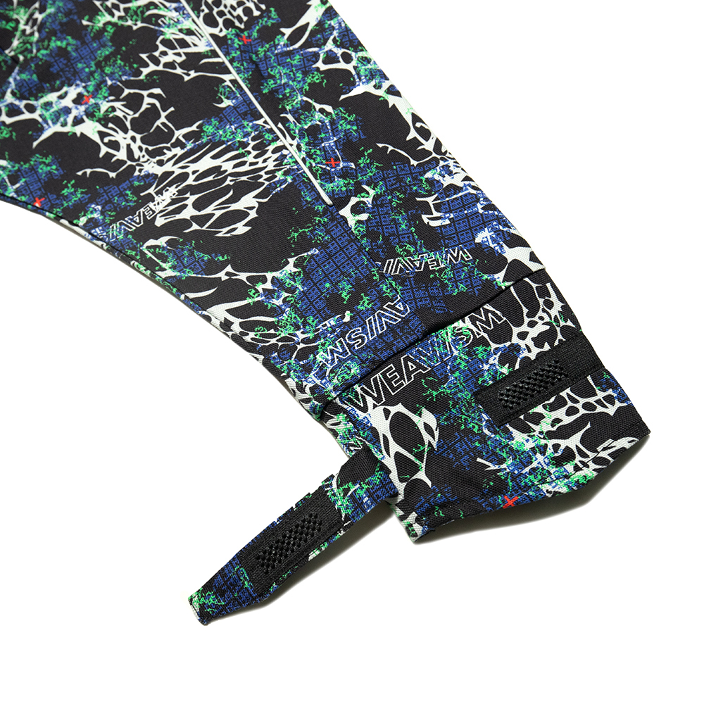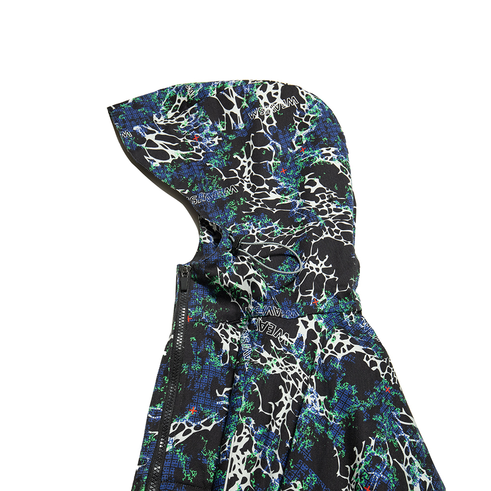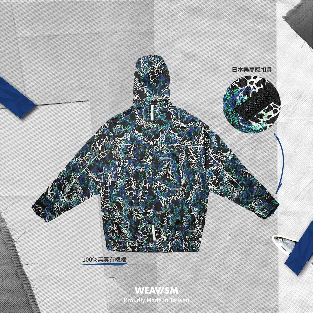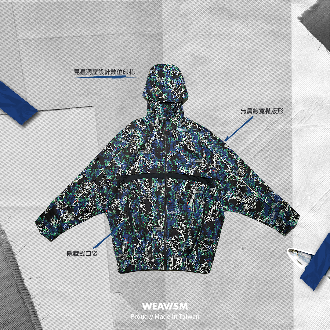 蟲窟印花外套為本季印花布料代表,圖案概念來自有如異世界蟲窟,帶有賽博龐克般的神秘感。無肩線設計自然服貼肩膀線條,