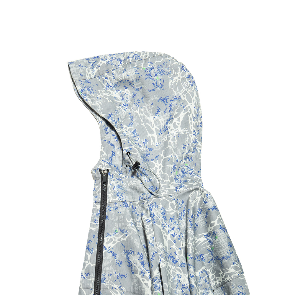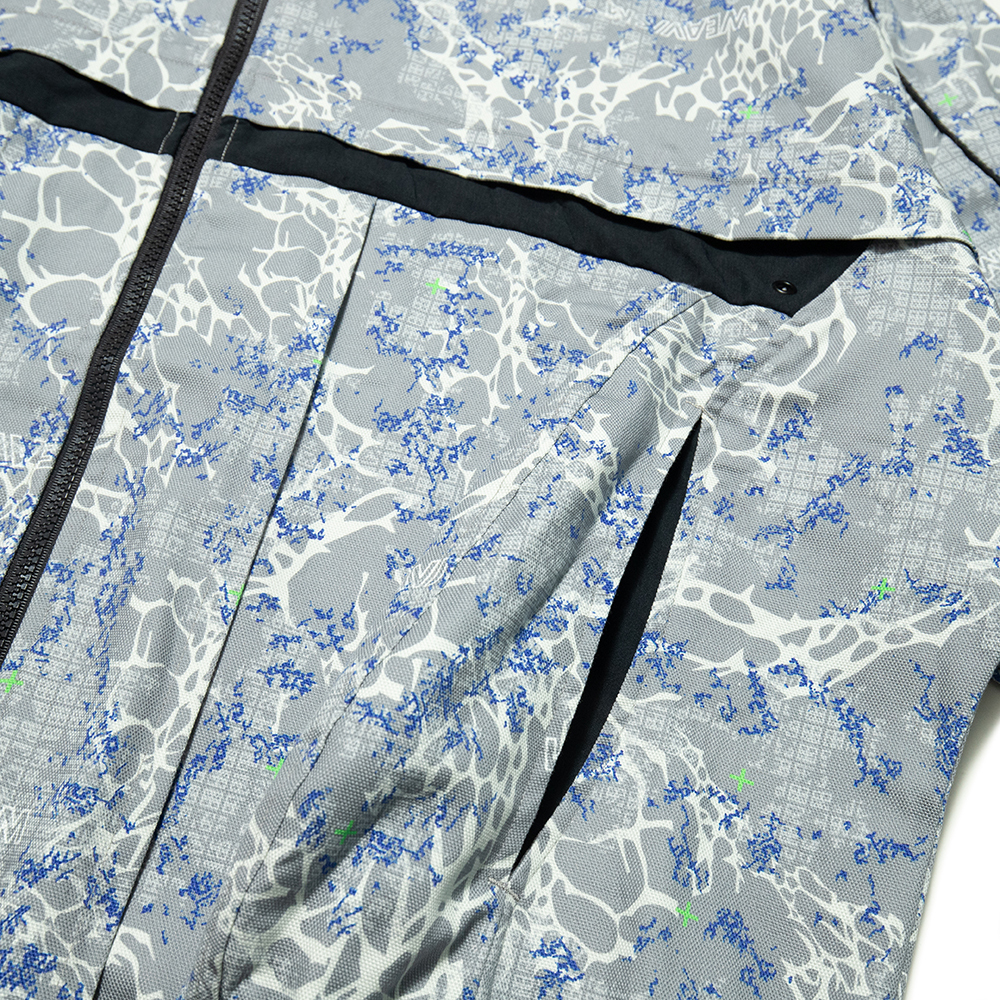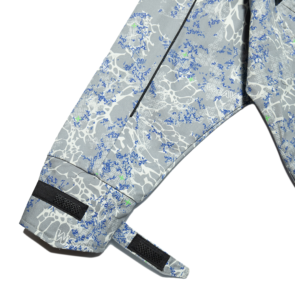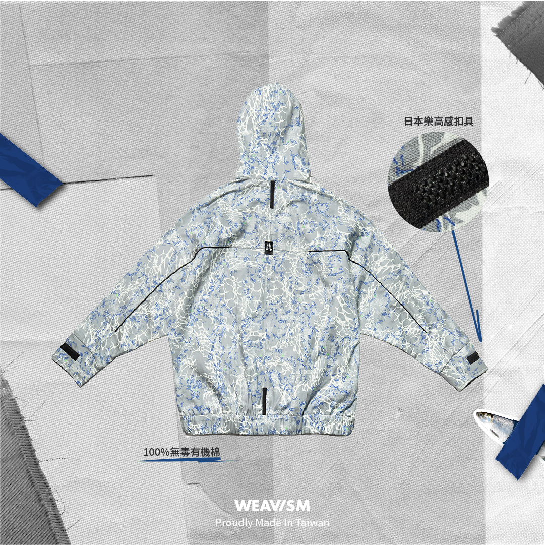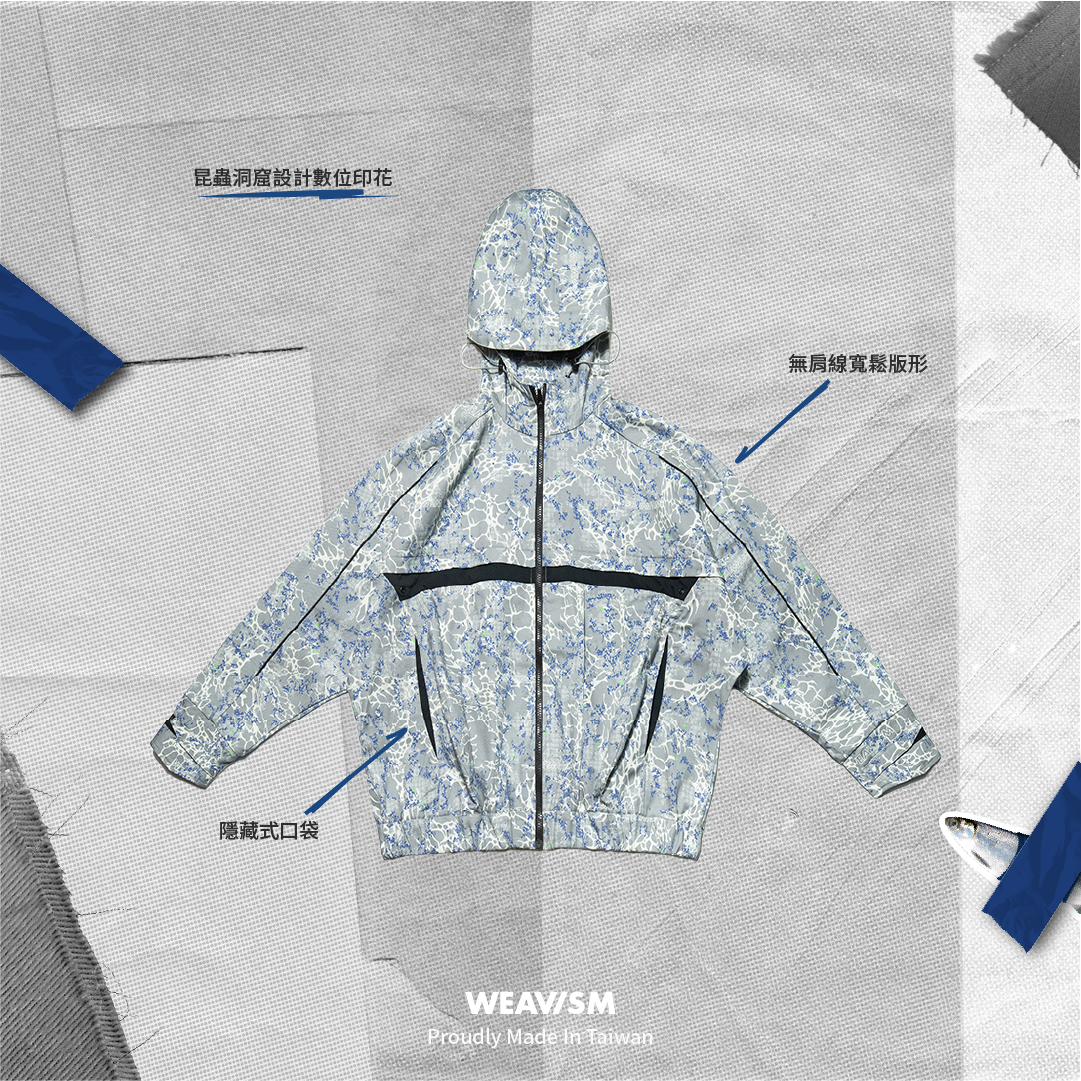 蟲窟印花外套為本季印花布料代表,圖案概念來自有如異世界蟲窟,帶有賽博龐克般的神秘感。無肩線設計自然服貼肩膀線條,