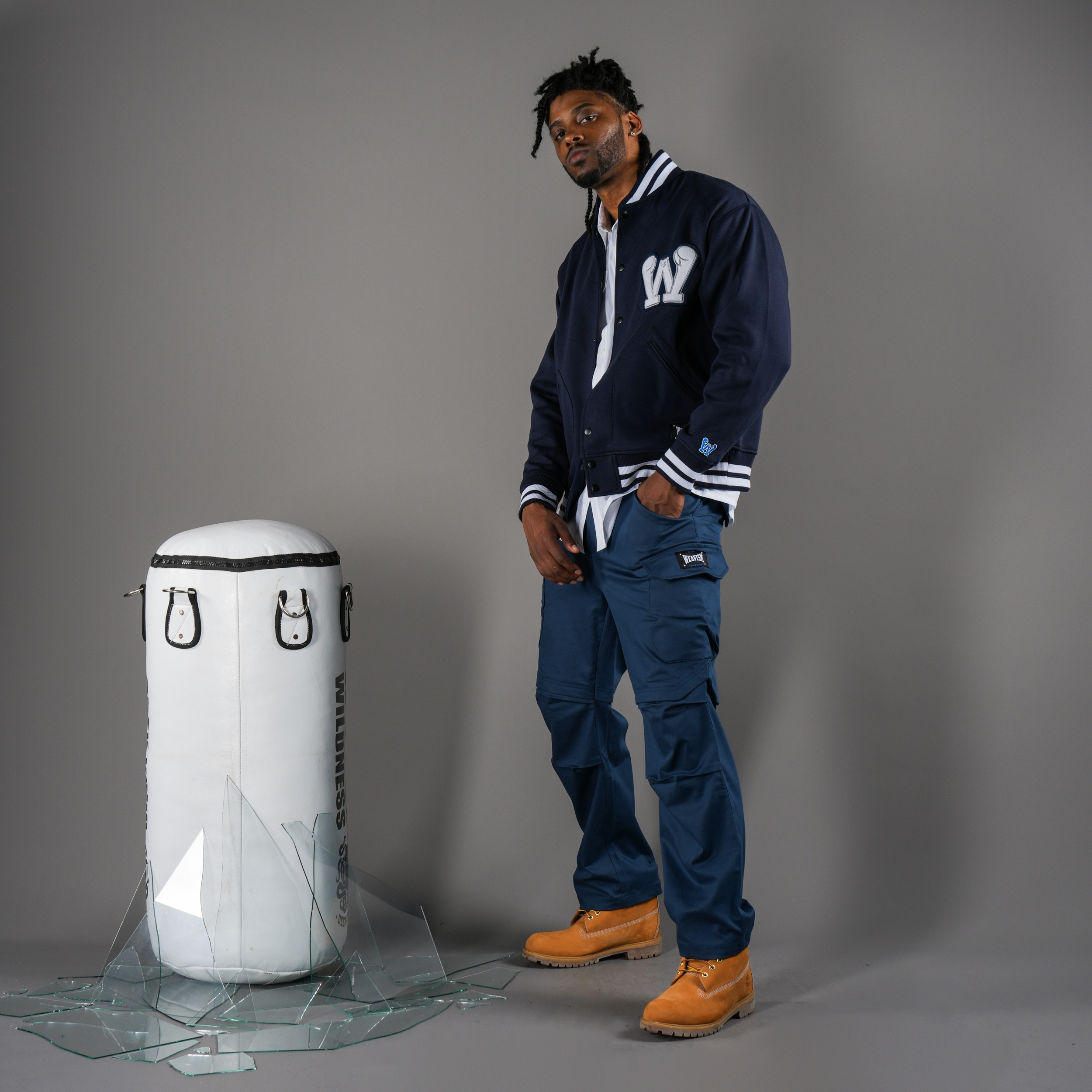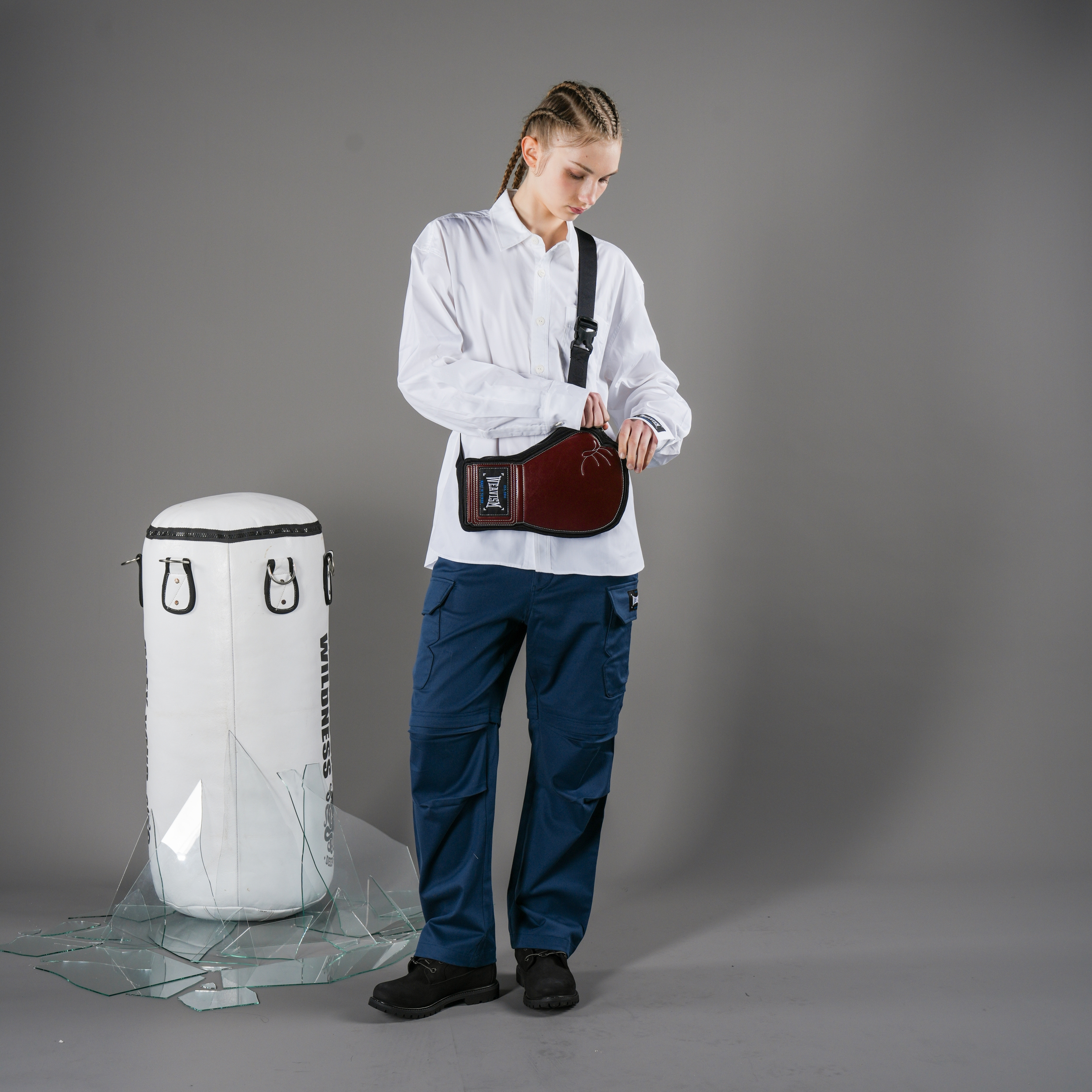 假兩件的設計,企圖將拳擊短褲與軍裝傘兵褲結合。褲子側邊拳擊手套造型口袋搭配工裝褲經典的膝摺。材質使用高磅數的棉,自私的想把軍人與拳手對戰的風格均融入此長褲中。