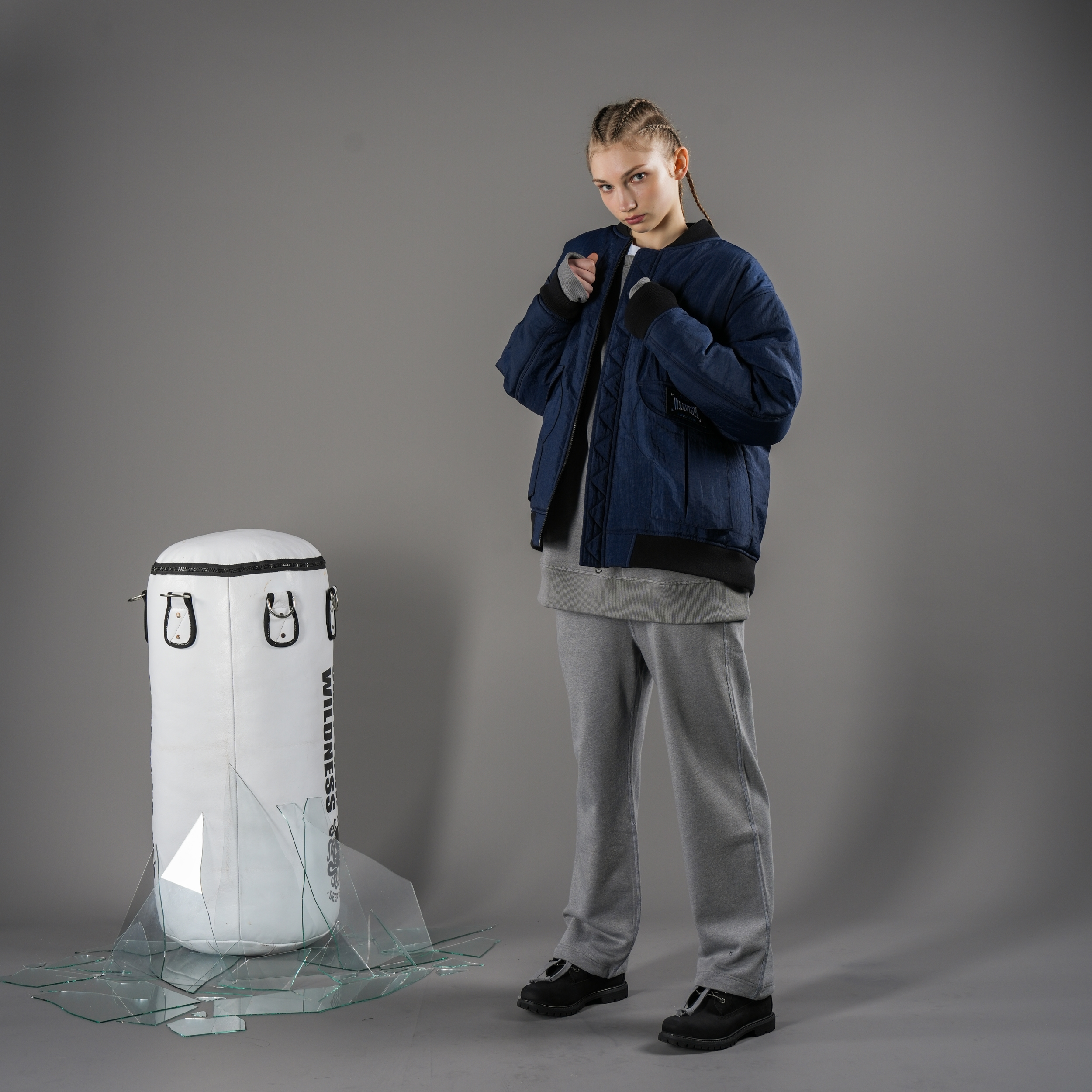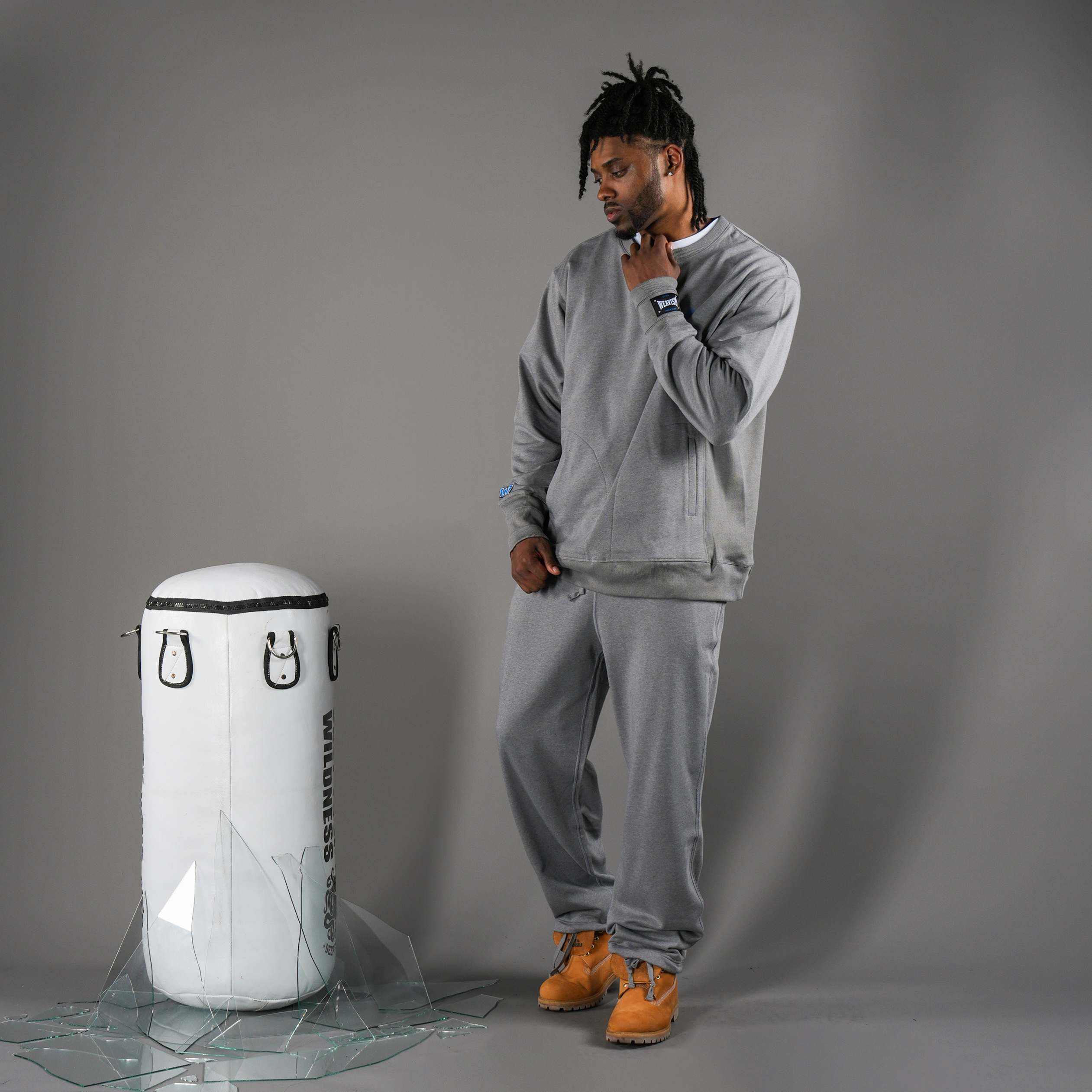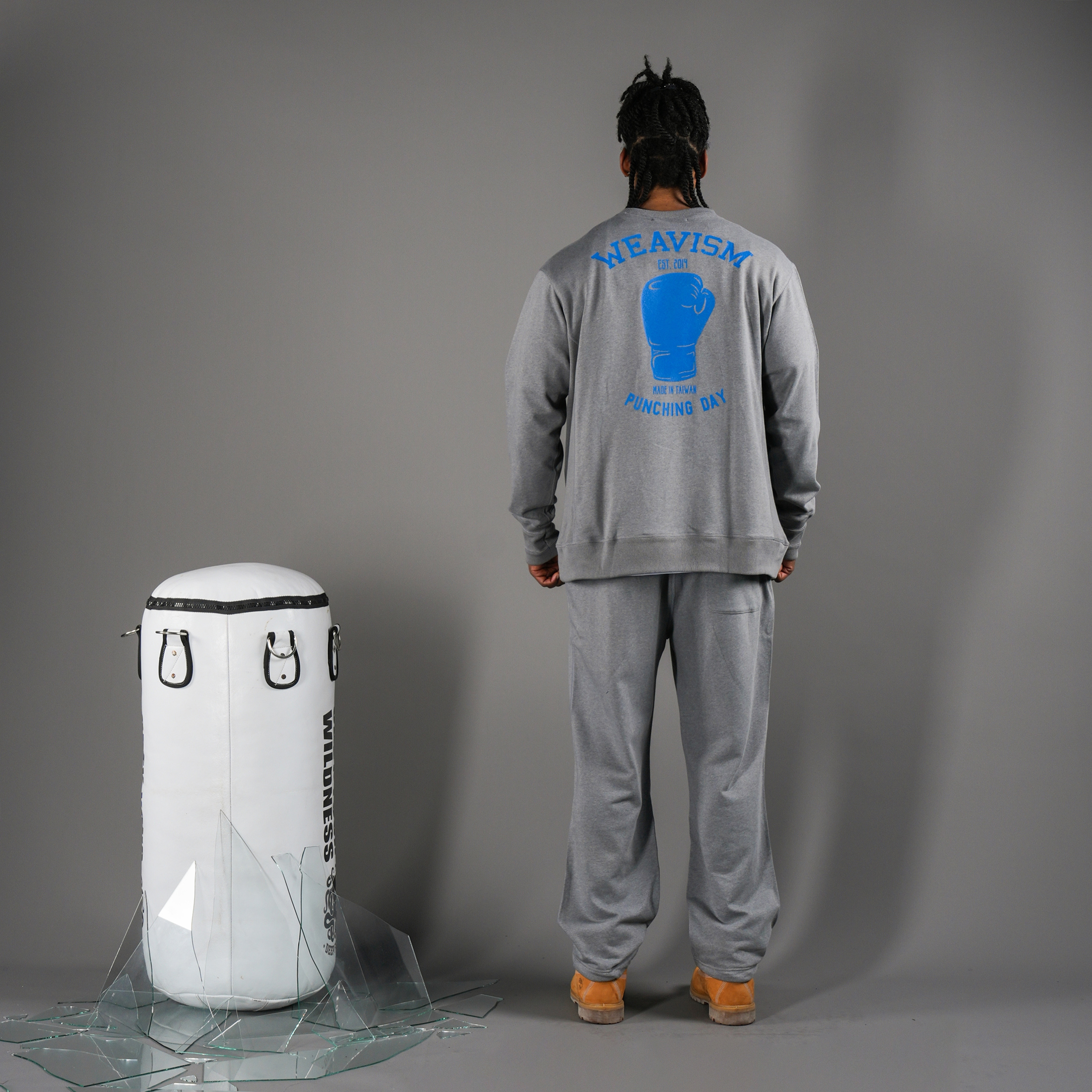 以右撇子來說,左拳以干擾及空距離為主,而右拳以重擊KO為目標,此訓練衛衣依此邏輯下去設計,袖口處三層螺紋設計,可將大拇指穿出呈現手綁帶時的樣貌。右手的刺繡W象徵Winning Punch。搭配衣服前後的爆裂膠印印花,想呈現一種擊碎目標的破碎感。